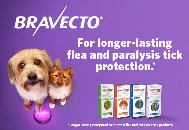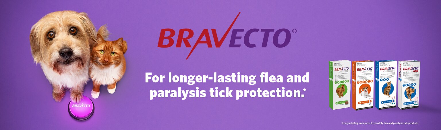 For dogs, Bravecto is available as a tasty, easily administered chewable tablet, or a convenient spot-on treatment. The chewable form provides 3 months of protection against fleas and 4 months protection against deadly paralysis ticks, as well as 2 months protection against bush ticks, and brown dog ticks. The spot-on treatment provides 6 months of protection against fleas and paralysis ticks, 12 weeks protection against brown dog ticks, as well as control of mites. For cats, Bravecto offers a spot-on solution that protects against fleas and paralysis ticks for three months, as well as control of ear mites. The Bravecto Plus range for cats also provides protection against heartworm, roundworm, and hookworm.