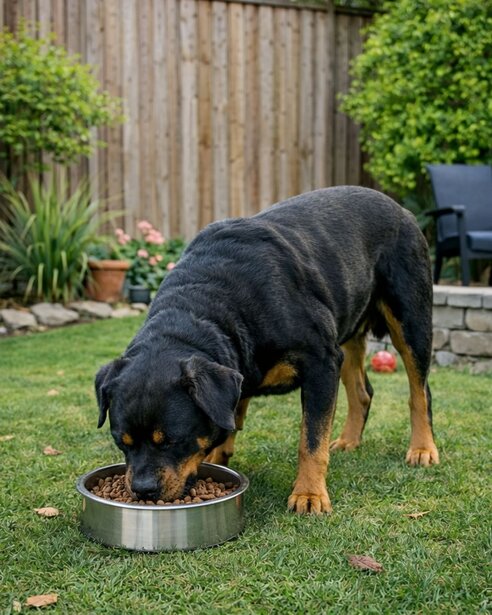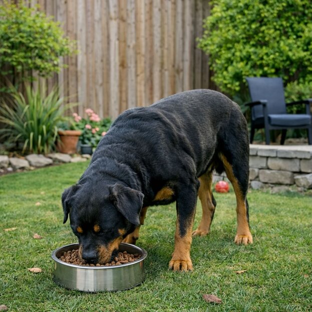 Since Rotties are prone to bloat, feeding smaller, frequent meals and using a slow feeder help to manage their eating pace and support better digestive health. Choosing a diet with high-quality, highly digestible ingredients can also help reduce gas production.