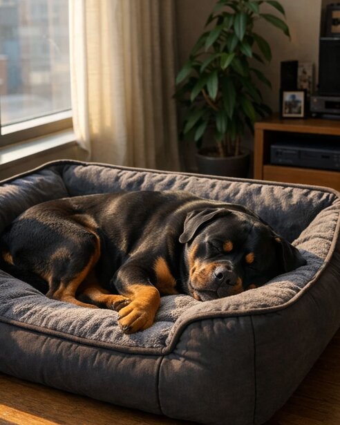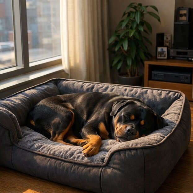 Ensure the bed is large enough for them to stretch out fully, as many Rotties enjoy sleeping on their sides or backs. A bed with raised bolsters can also provide a sense of security and a comfortable place for them to rest their head. For outdoor use, an elevated trampoline-style bed is a great option to keep them cool and off the hard ground.