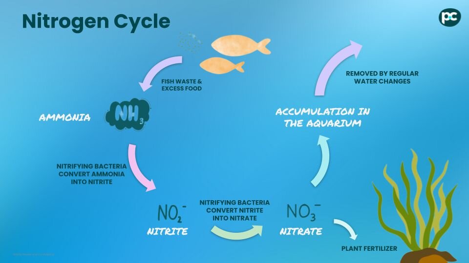 As your fish poops and waste is generated in your aquarium from uneaten food and rotting plants, the breakdown of these products releases ammonia into the water. Ammonia is highly toxic to fish. Beneficial bacteria known as nitrifying bacteria will naturally appear in the tank when being cycled, and they start to break down this ammonia, eventually consuming it faster than it is being released