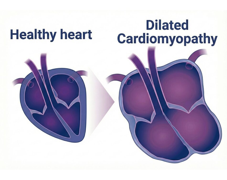 DCM is often an inherited condition where the heart muscles become weak and flimsy. Because the muscle walls are weak, the heart cannot contract strongly enough to pump blood effectively.