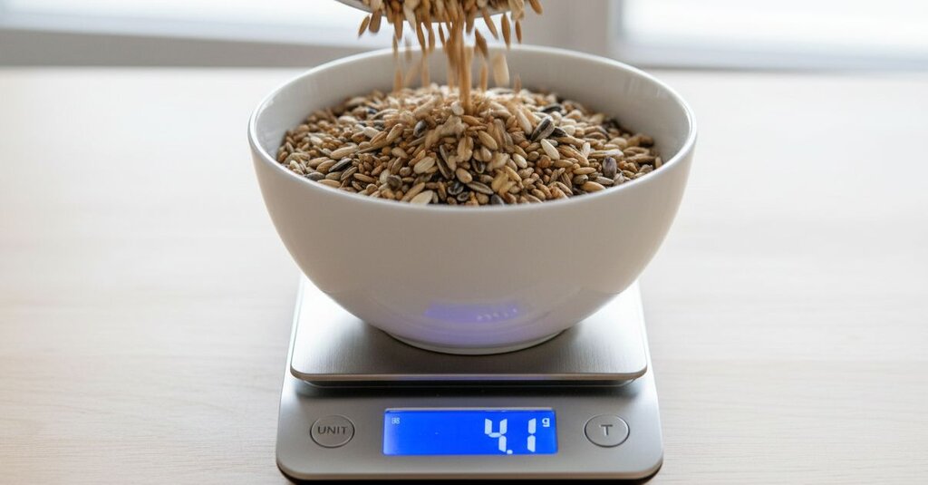 - Calculate the amount of seed your bird currently eats per day: To do this, ensure you have access to digital scales that weigh in 1 gram increments. Place a measured amount of seed in the food dish each morning. The next morning, measure the remaining seed and the difference is the daily seed consumption in grams. Repeat for 3 - 4 days and calculate the average seed consumption per day for your bird.