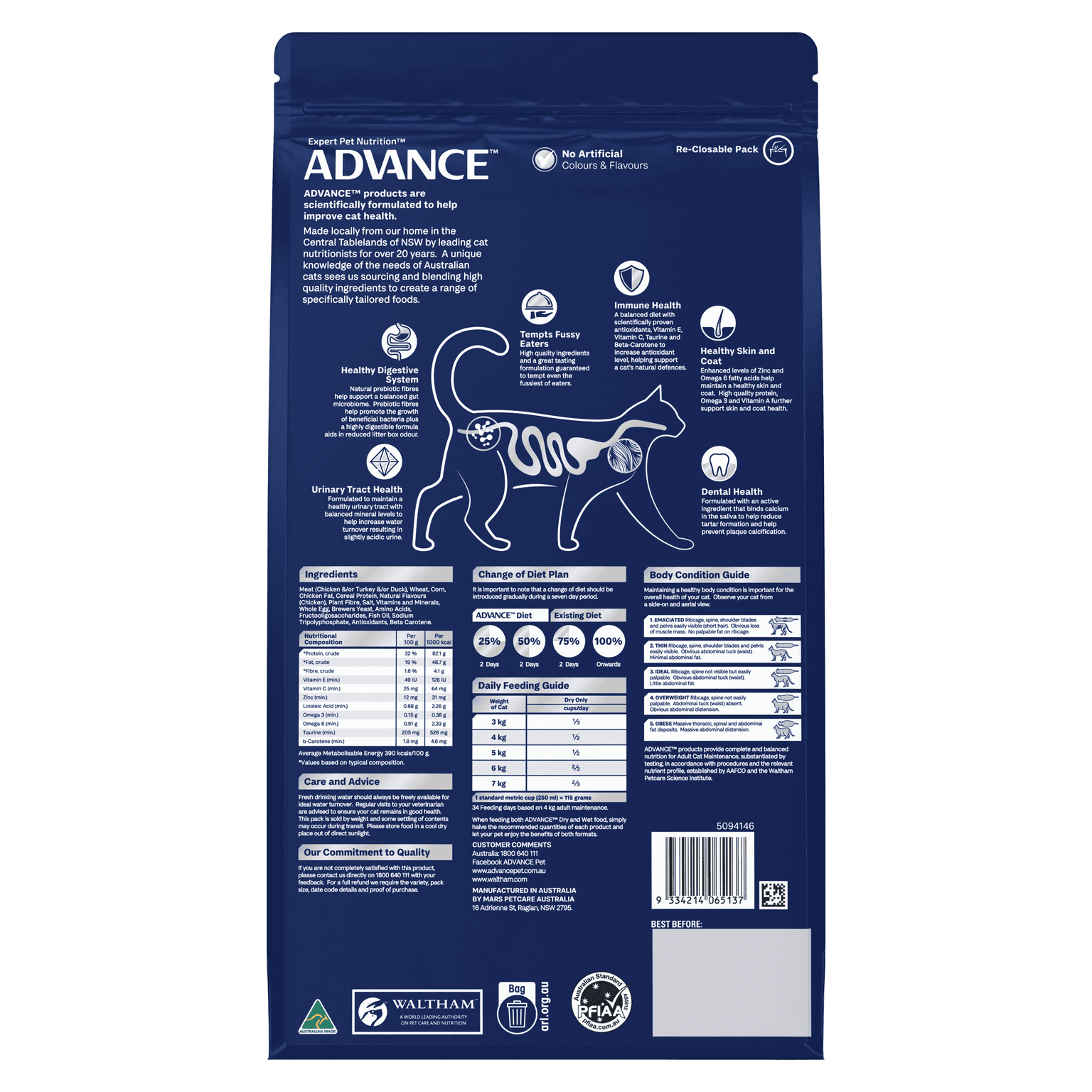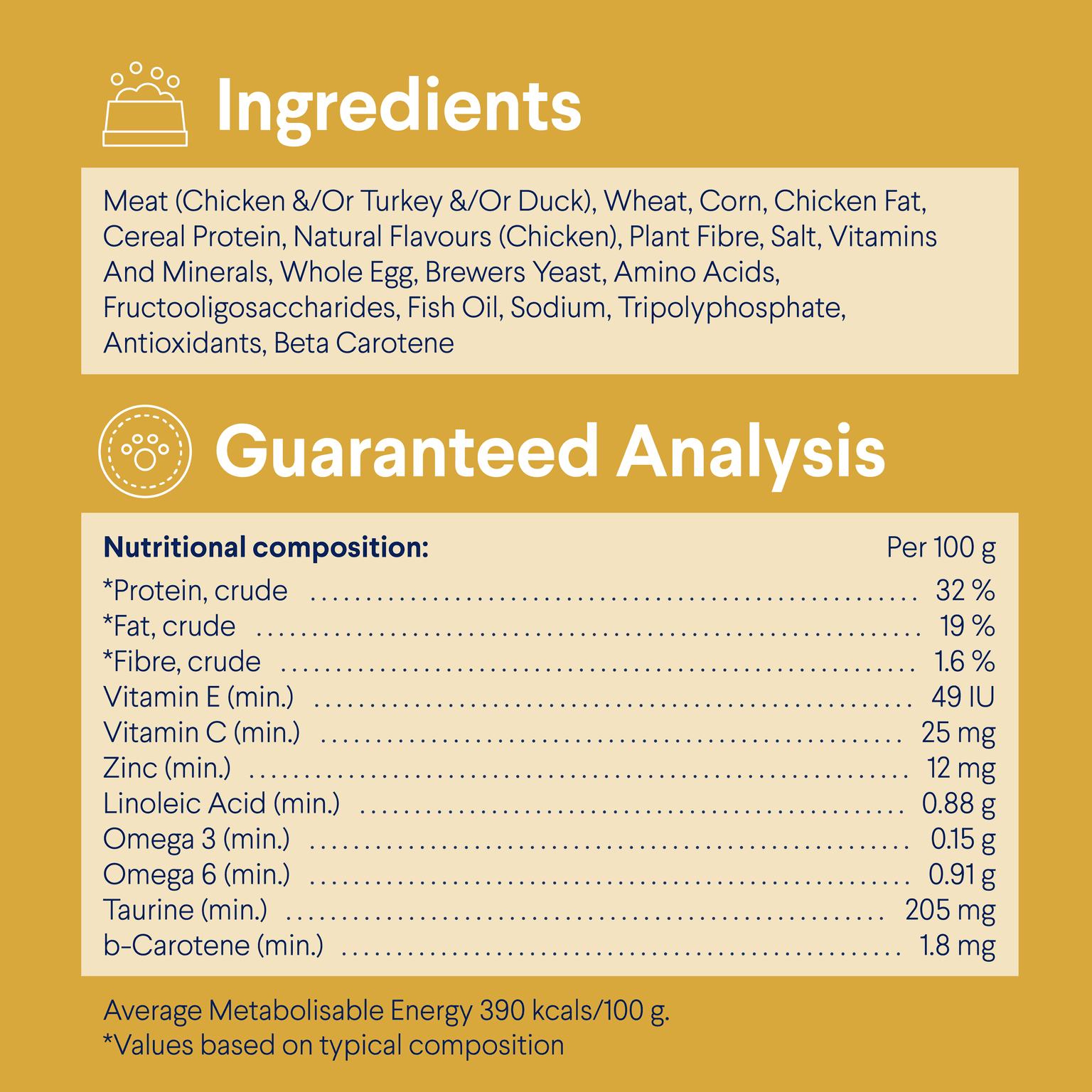 Meat (Chicken &/Or Turkey &/Or Duck), Wheat, Corn, Chicken Fat, Cereal Protein, Natural Flavours (Chicken), Plant Fibre, Salt, Vitamins And Minerals, Whole Egg, Brewers Yeast, Amino Acids, Fructooligosaccharides, Fish Oil, Sodium Tripolyphosphate, Antioxidants, Beta Carotene