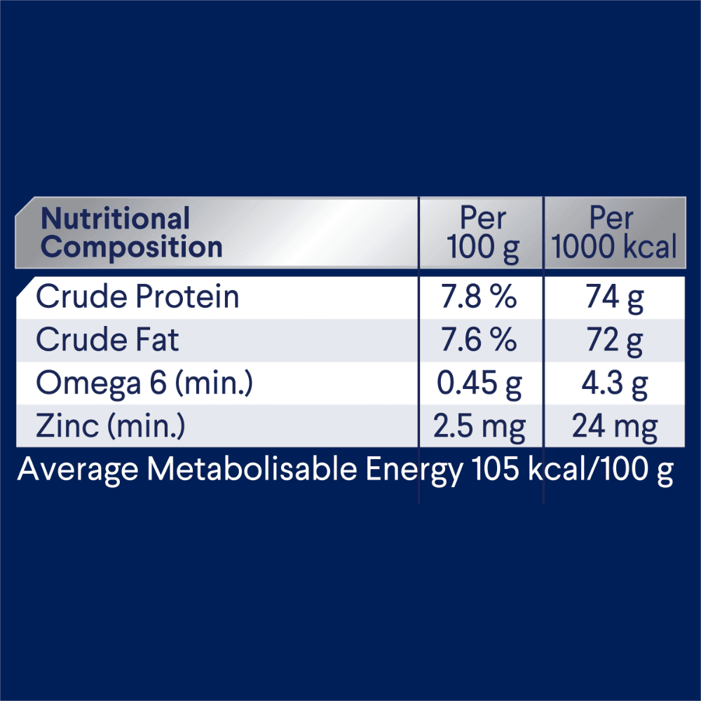 Chicken, Salmon, Rice, Sheep, Vegetable Fibre, Gelling Agents, Vegetable Oil, Minerals & Vitamins, Amino Acids, Antioxidants, Plant Extracts