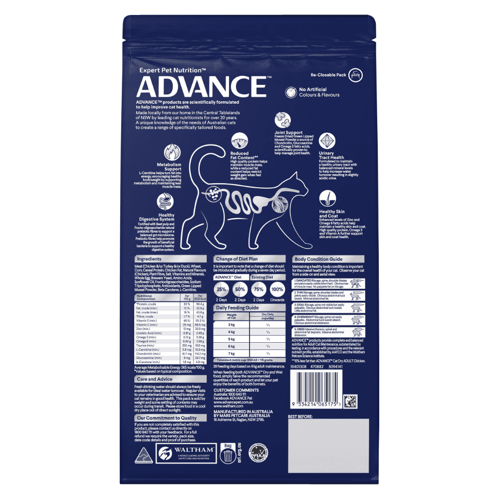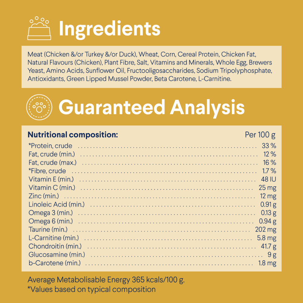 Meat (Chicken &/Or Turkey &/Or Duck), Wheat, Corn, Cereal Protein, Chicken Fat, Natural Flavours (Chicken), Plant Fibre, Salt, Vitamins And Minerals, Whole Egg, Brewers Yeast, Amino Acids, Sunflower Oil, Fructooligosaccharides, Sodium Tripolyphosphate, Antioxidants, Green Lipped Mussel Powder, Beta Carotene, L-Carnitine