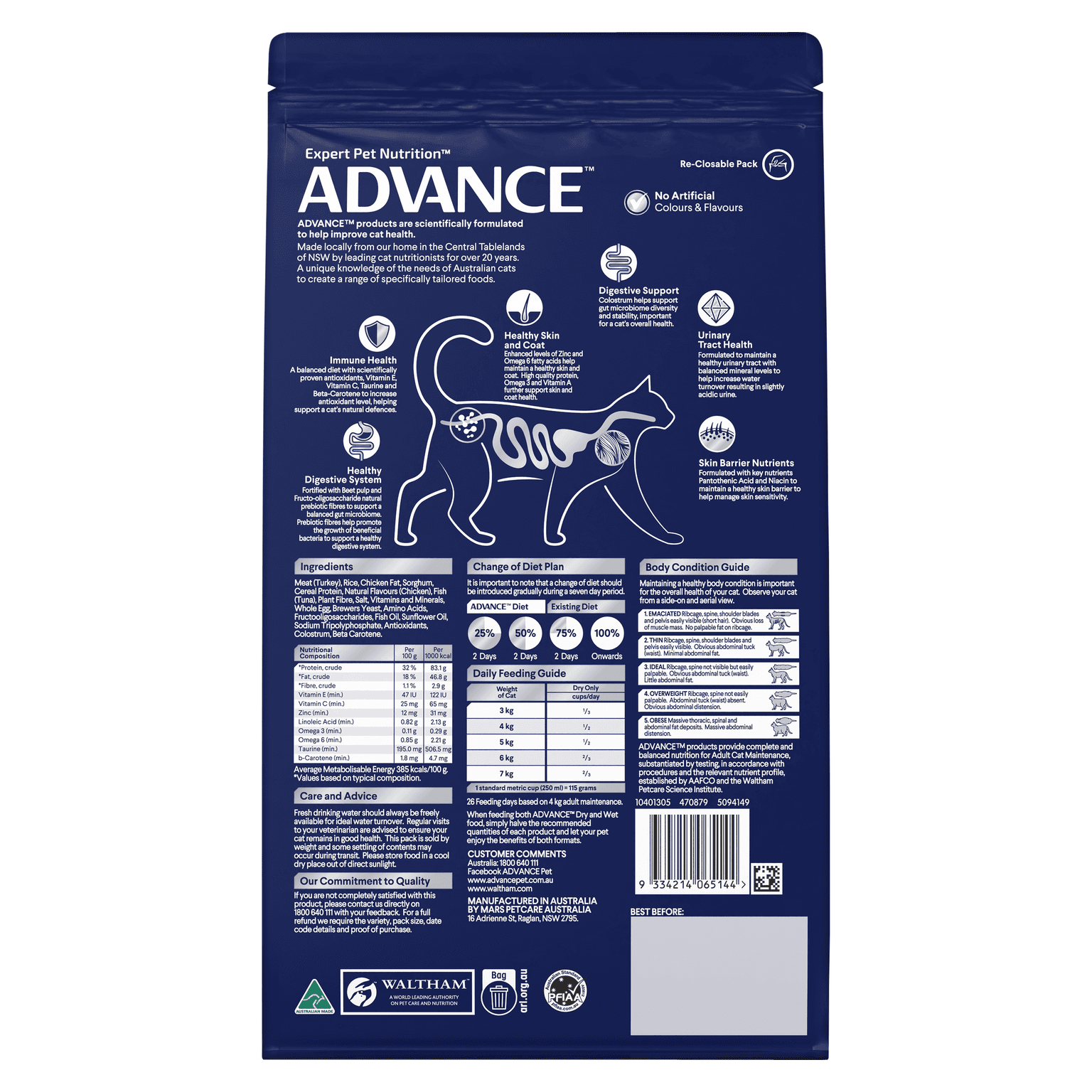ADVANCE Sensitive Skin & Digestion Adult Dry Cat Food is designed to support cats with skin sensitivities and digestive issues. This scientifically formulated recipe features key nutrients and fibres that promote overall health, both inside and out.