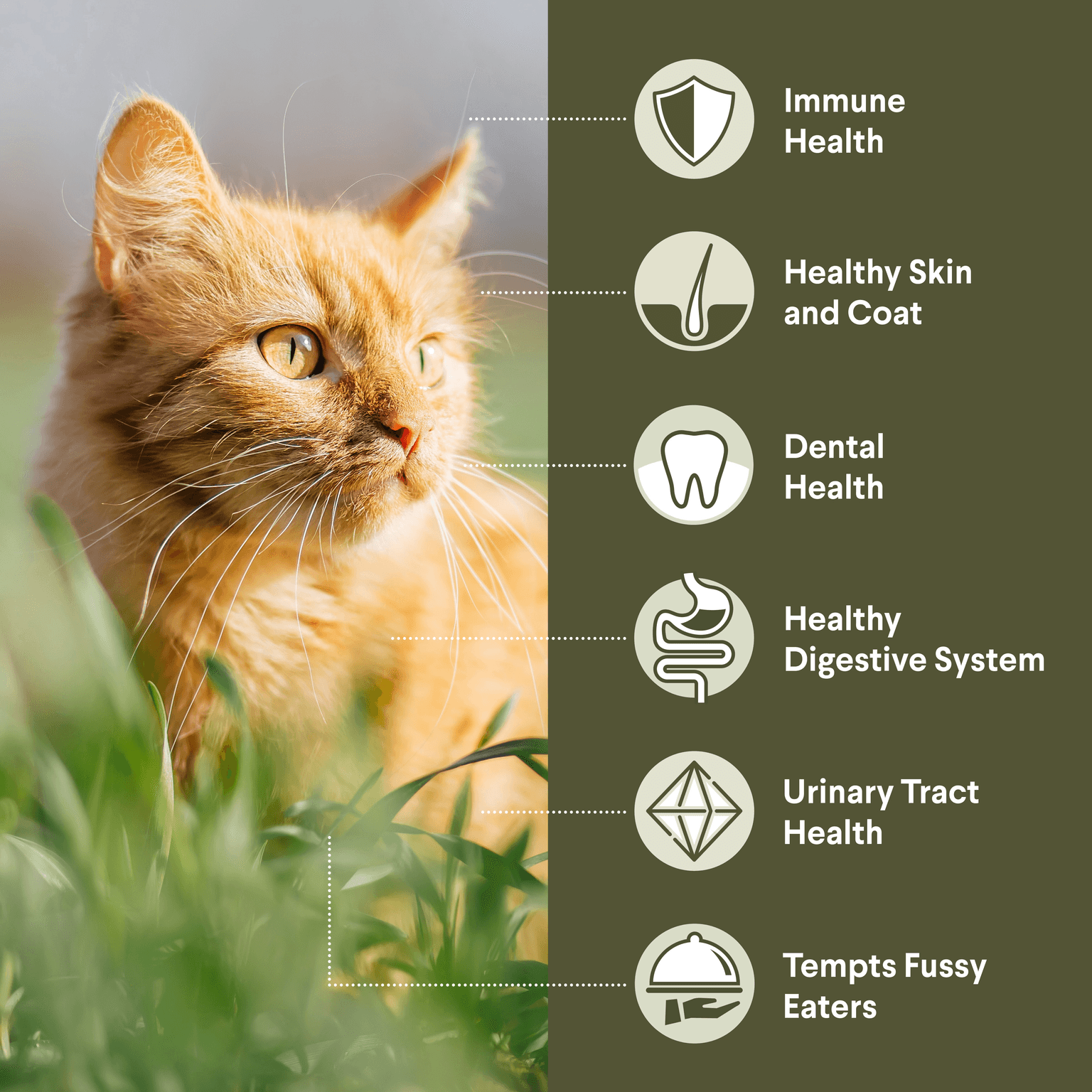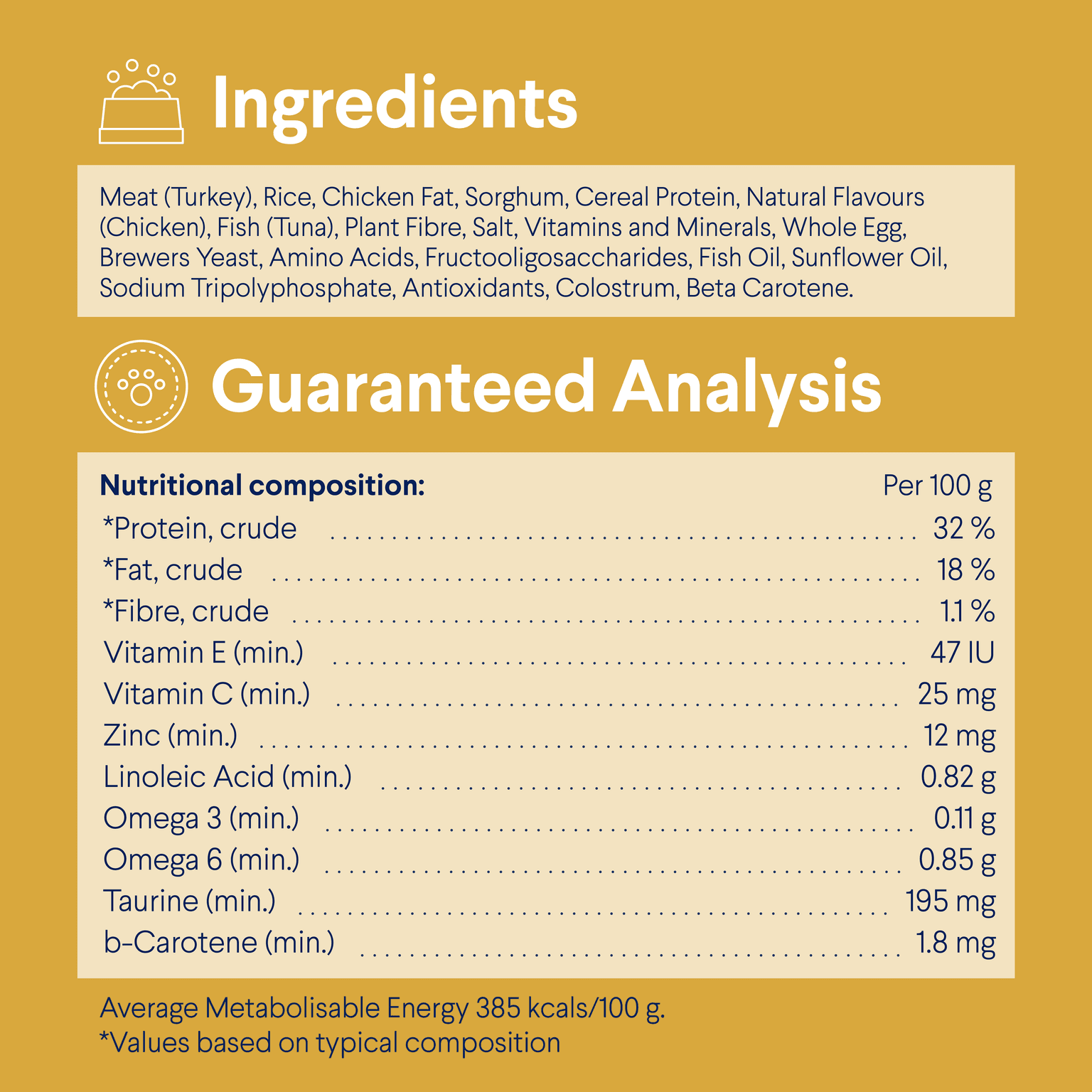 Meat (Turkey), Rice, Chicken Fat, Sorghum, Cereal Protein, Natural Flavours (Chicken), Fish (Tuna), Plant Fibre, Salt, Vitamins And Minerals, Whole Egg, Brewers Yeast, Amino Acids, Fructooligosaccharides, Fish Oil, Sunflower Oil, Sodium Tripolyphosphate, Antioxidants, Colostrum, Beta Carotene