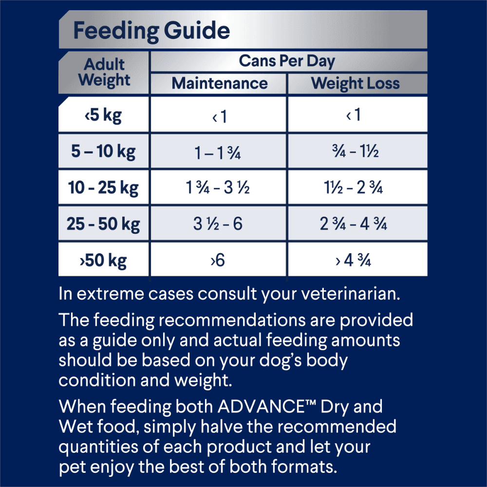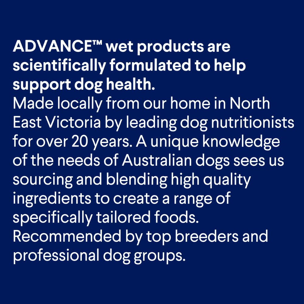 ADVANCE Adult Weight Control Chicken & Rice is a super premium, Australian-made dog food tailored for adult dogs who require fewer calories, such as less active or obesity-prone canines. ADVANCE wet products are scientifically formulated to help support dog health, with ADVANCE Adult Weight Control Chicken & Rice assisting in restricting weight gain to help support a longer life.