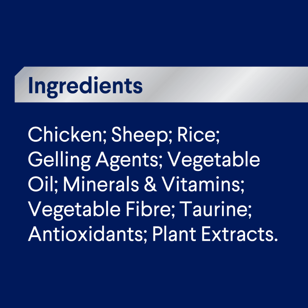 Chicken, Sheep, Rice, Gelling Agents, Vegetable Oil, Minerals & Vitamins, Vegetable Fibre, Taurine, Antioxidants, Plant Extracts