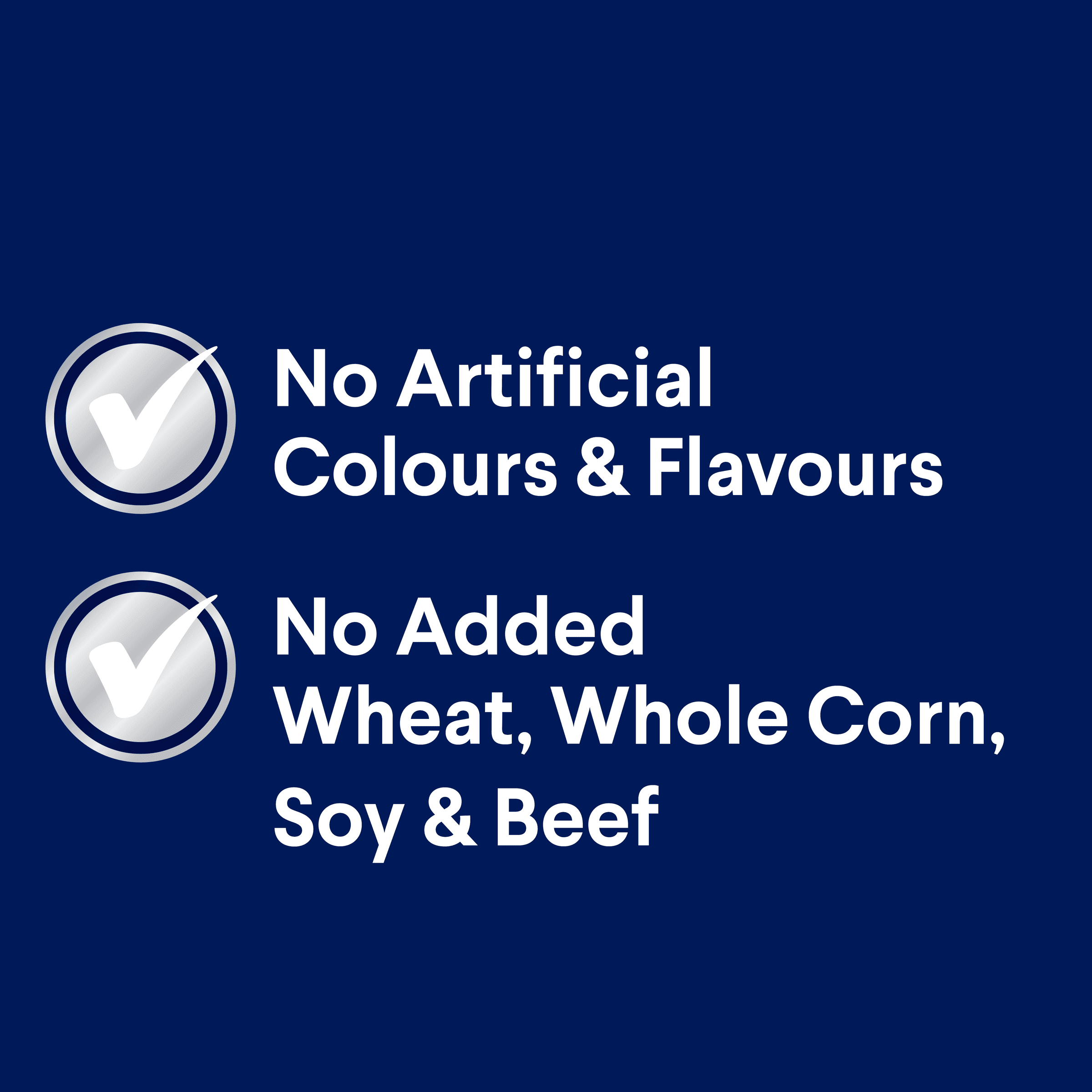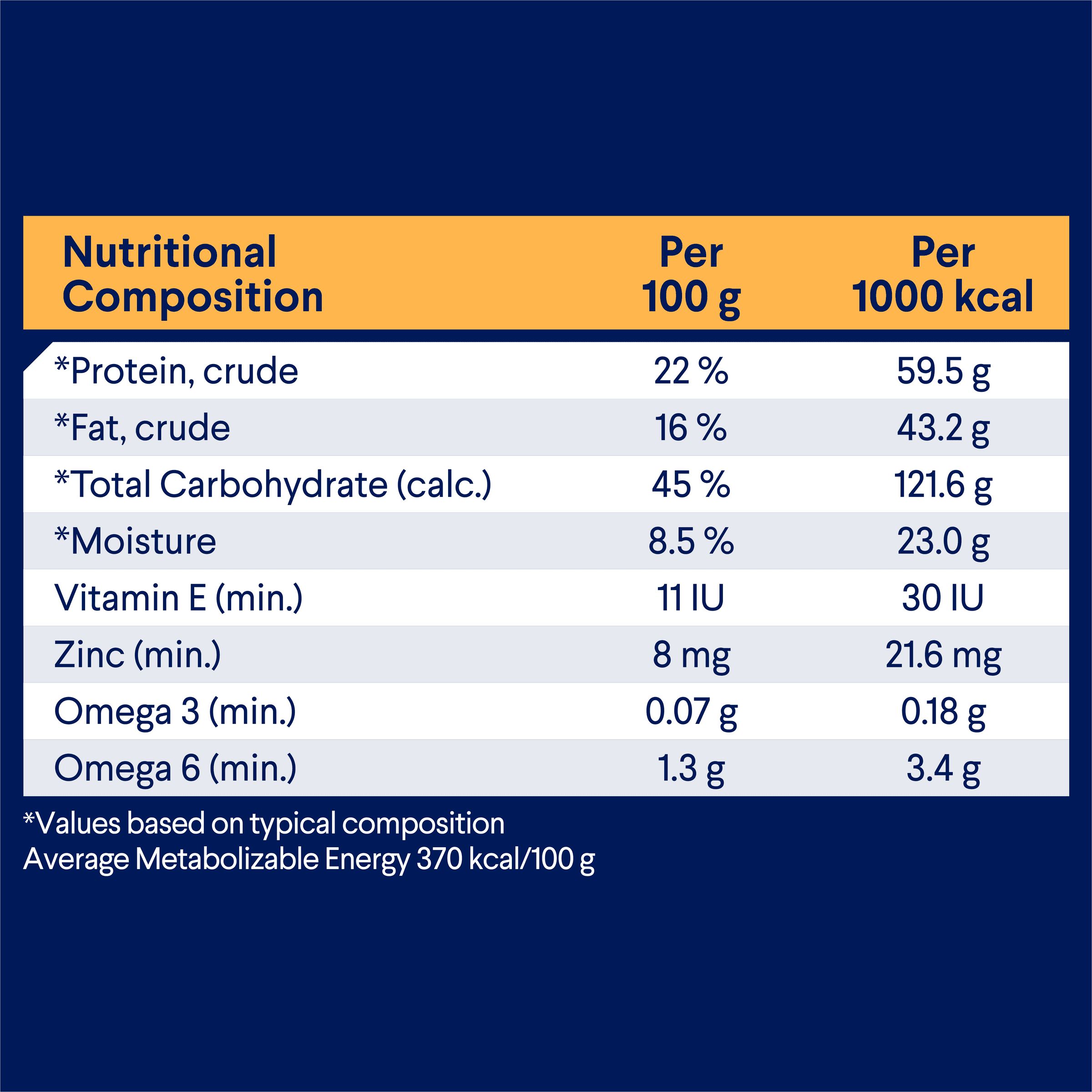 Poultry Meal (Chicken (equiv. 47% Chicken) &/or Turkey &/or Duck), Rice (14%), Sorghum, Poultry Fat, Rice Flour (6%), Barley, Natural Flavour (Chicken), Dried Beet Pulp, Vitamins and Minerals, Salt, Sodium Tripolyphosphate, Antioxidants, Amino Acid (Methionine), Fructooligosaccharides