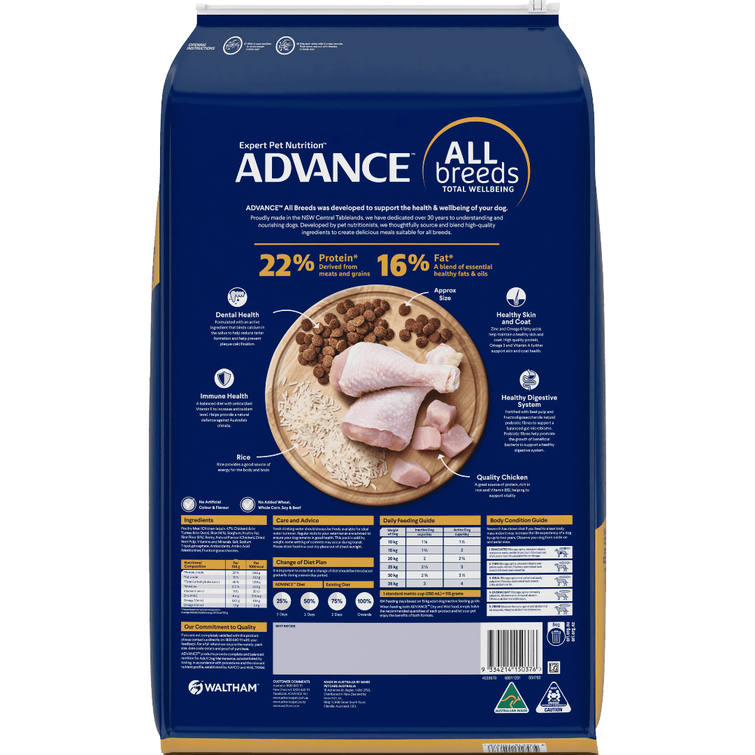 The Advance All Breeds Adult Dry Dog Food Chicken And Rice is a super premium, scientifically formulated meal designed to support the total wellbeing of adult dogs. Proudly made in Australia, this recipe uses high-quality chicken and select natural ingredients to deliver complete and balanced nutrition for your companion.