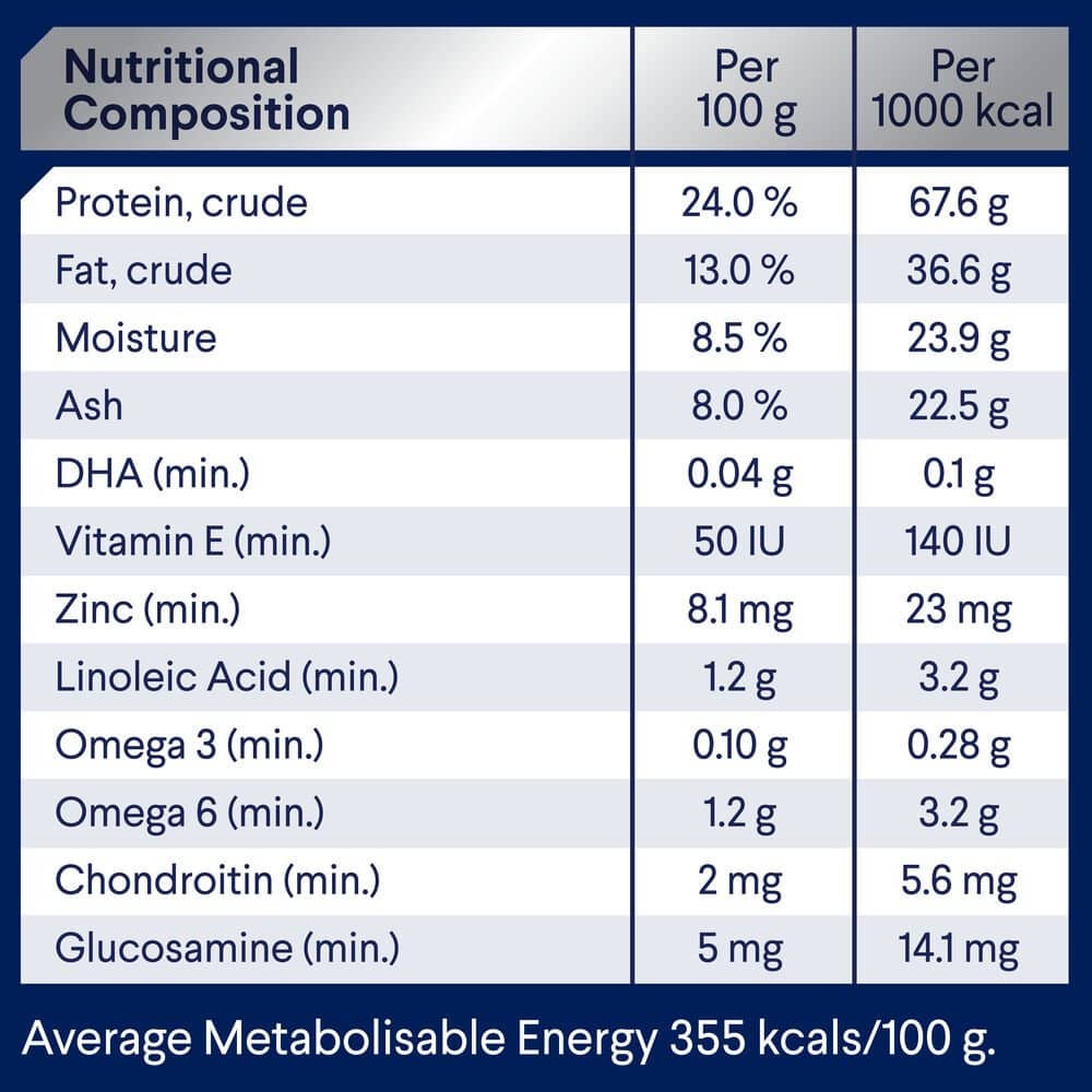 Chicken Meal, Rice, Sorghum, Rice Flour, Chicken Fat, Dried Beet Pulp, Natural Flavour (Chicken), Sunflower Oil, Turkey Meal, Vitamins and Minerals, Salt, Inulin, Fish Oil, Antioxidants, Green Lipped Mussel Powder, Amino Acids (incl. Methionine)