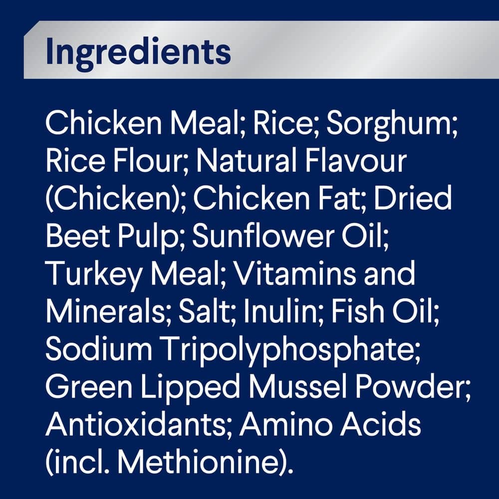 Chicken Meal, Rice, Sorghum, Rice Flour, Chicken Fat, Dried Beet Pulp, Natural Flavour (Chicken), Sunflower Oil, Turkey Meal, Vitamins and Minerals, Salt, Inulin, Fish Oil, Sodium Tripolyphosphate, Green Lipped Mussel Powder, Antioxidants, Amino Acids (incl. Methionine)