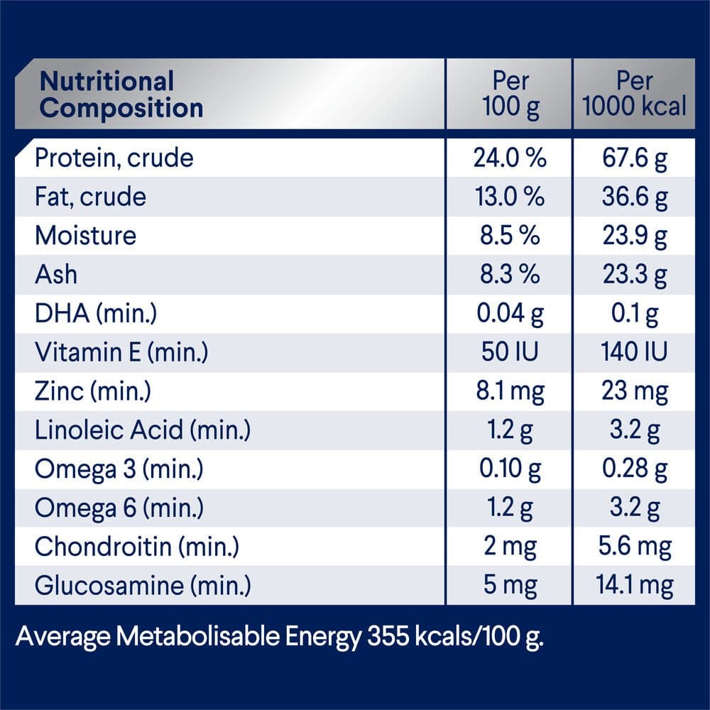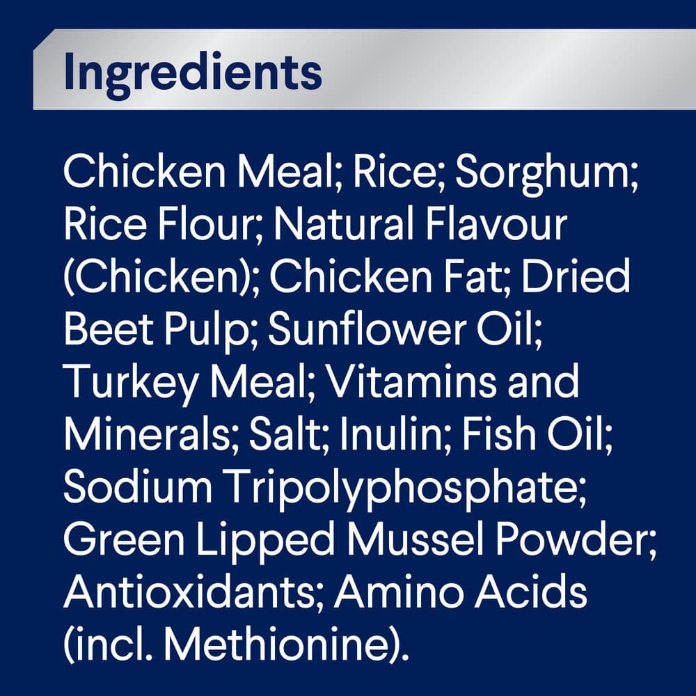Chicken Meal, Rice, Sorghum, Rice Flour, Chicken Fat, Dried Beet Pulp, Natural Flavour (Chicken), Sunflower Oil, Turkey Meal, Vitamins and Minerals, Salt, Inulin, Fish Oil, Sodium Tripolyphosphate, Green Lipped Mussel Powder, Antioxidants, Amino Acids (incl. Methionine)