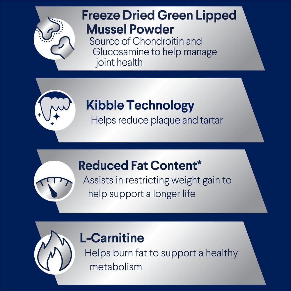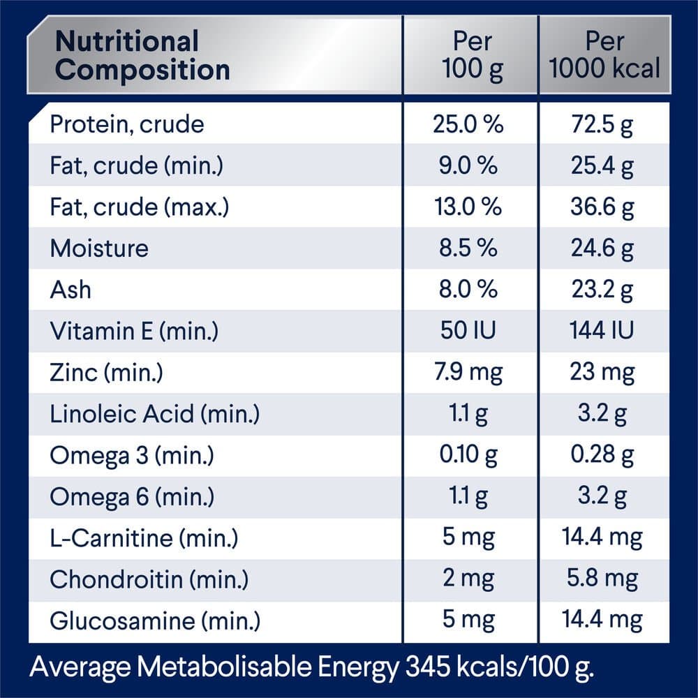 Rice, Chicken Meal, Sorghum, Dried Beet Pulp, Natural Flavour (Chicken), Chicken Fat, Turkey Meal, Sunflower Oil, Salt, Vitamins and Minerals, Inulin, Green Lipped Mussel Powder, Antioxidants, Amino Acids (incl. Methionine), L-Carnitine
