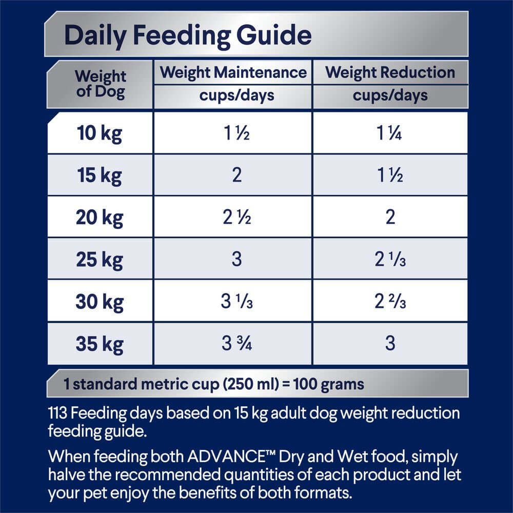 ADVANCE Adult Dog Healthy Weight Medium Breed Chicken with Rice is specially formulated to help adult dogs maintain a healthy weight, providing the right balance of nutrients for optimal health. With a blend of high-quality natural ingredients and global scientific research, this food supports weight management while ensuring your dog gets the essential nutrients they need to stay active and healthy
