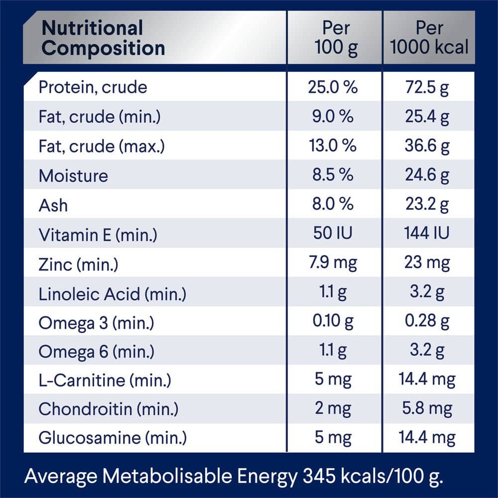 Rice, Chicken Meal, Sorghum, Dried Beet Pulp, Natural Flavour (Chicken), Chicken Fat, Turkey Meal, Sunflower Oil, Salt, Vitamins and Minerals, Inulin, Green Lipped Mussel Powder, Antioxidants, Amino Acids (incl. Methionine), L-Carnitine