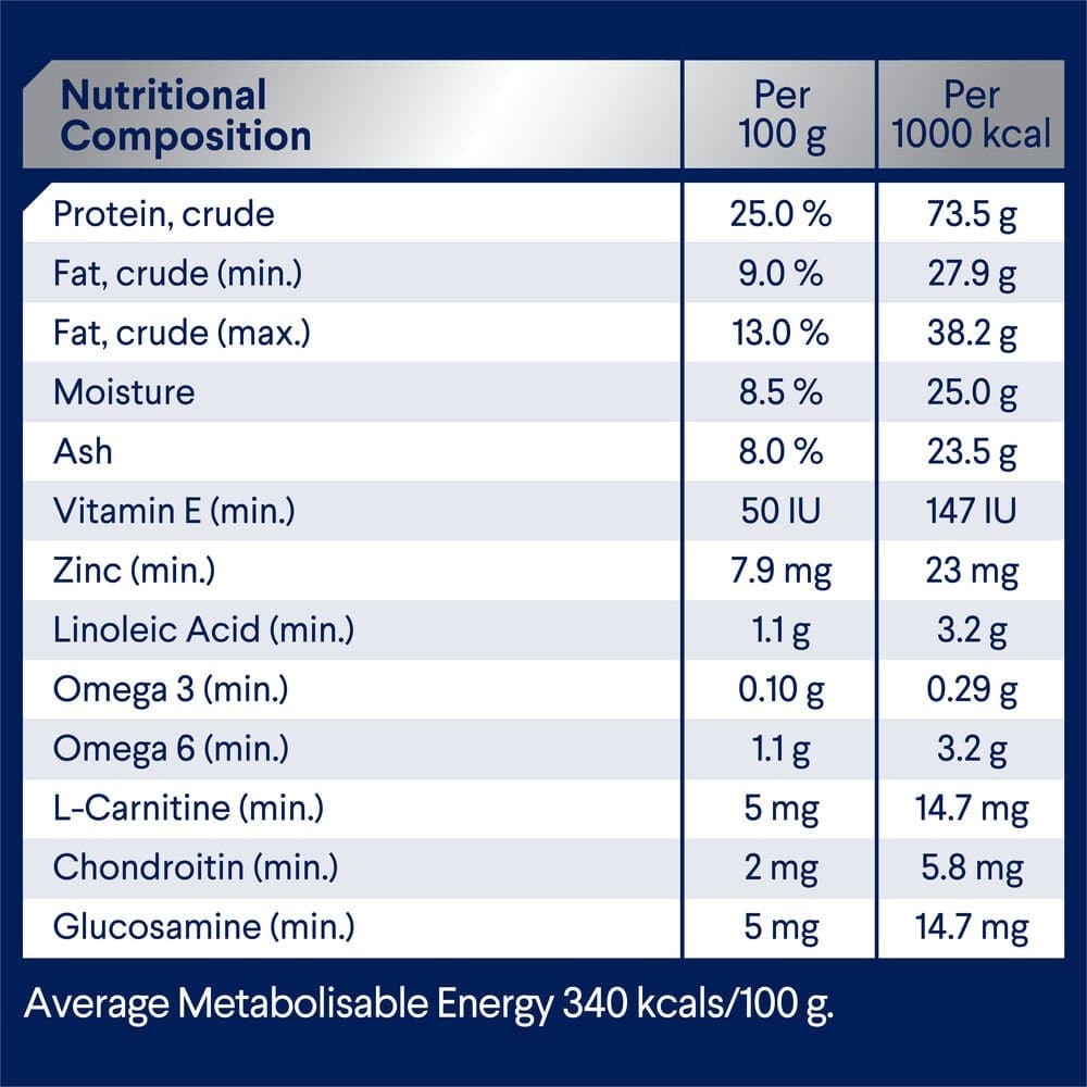 Rice, Chicken Meal, Sorghum, Dried Beet Pulp, Natural Flavour (Chicken), Chicken Fat, Sunflower Oil, Turkey Meal, Salt, Vitamins and Minerals, Sodium Tripolyphosphate, lnulin, Green Lipped Mussel Powder, Amino Acids (incl. Methionine), Antioxidants, L Carnitine