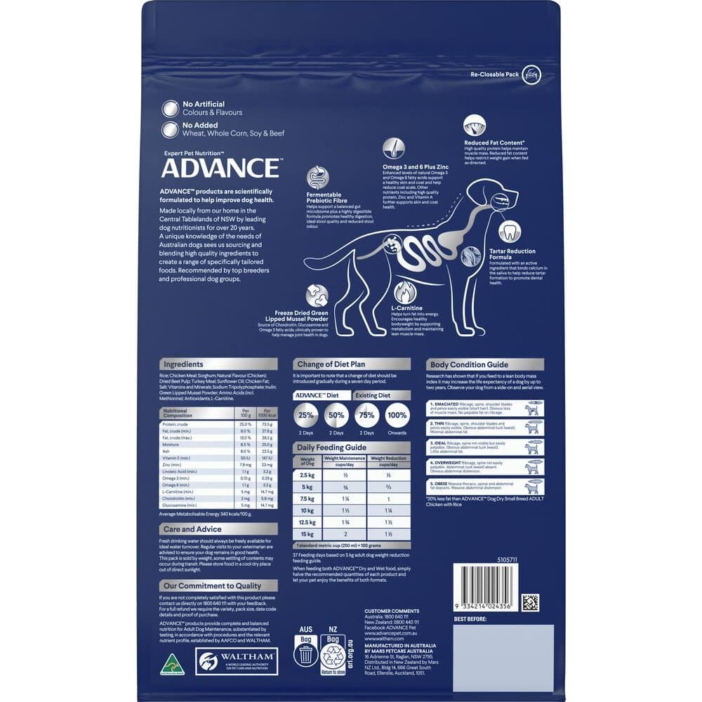 ADVANCE Healthy Weight Small Adult Dry Dog Food Chicken with Rice is specially designed to help small and toy breed dogs maintain a healthy weight while providing optimal nutrition for their unique needs. This dry food combines high-quality natural ingredients with scientific formulations, tailored to support weight management and overall health for your small breed dog. Made in Australia, this premium dry dog food ensures your pet stays healthy and satisfied.