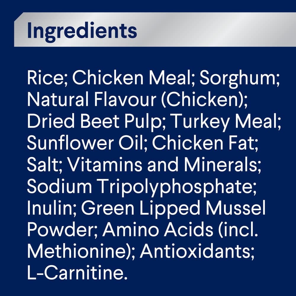 Rice, Chicken Meal, Sorghum, Dried Beet Pulp, Natural Flavour (Chicken), Chicken Fat, Sunflower Oil, Turkey Meal, Salt, Vitamins and Minerals, Sodium Tripolyphosphate, lnulin, Green Lipped Mussel Powder, Amino Acids (incl. Methionine), Antioxidants, L Carnitine
