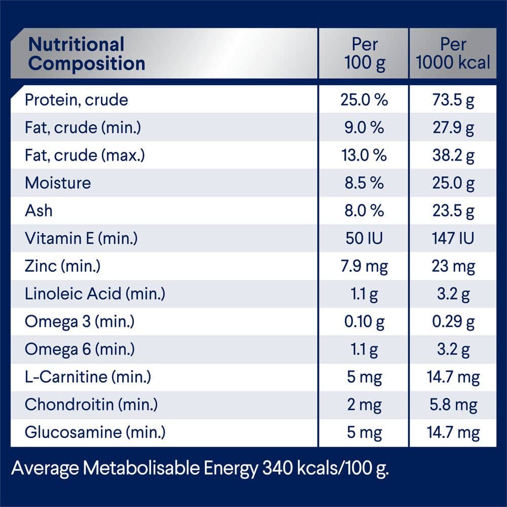 Rice, Chicken Meal, Sorghum, Dried Beet Pulp, Natural Flavour (Chicken), Chicken Fat, Sunflower Oil, Turkey Meal, Salt, Vitamins and Minerals, Sodium Tripolyphosphate, lnulin, Green Lipped Mussel Powder, Amino Acids (incl. Methionine), Antioxidants, L Carnitine