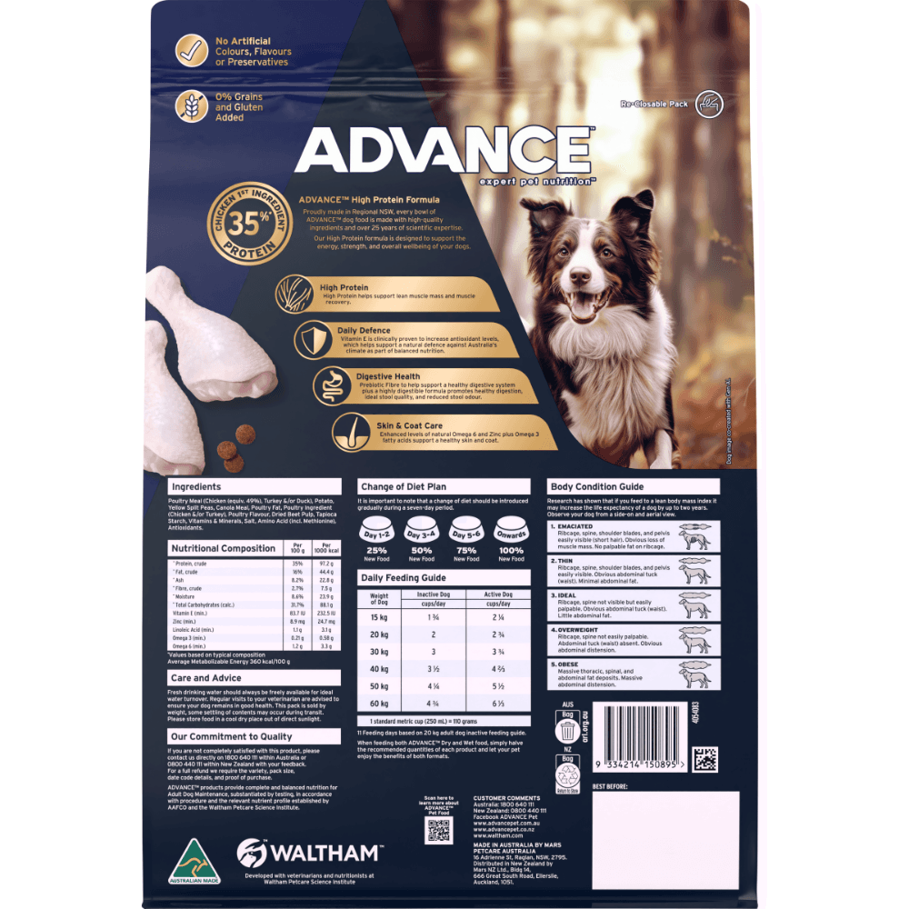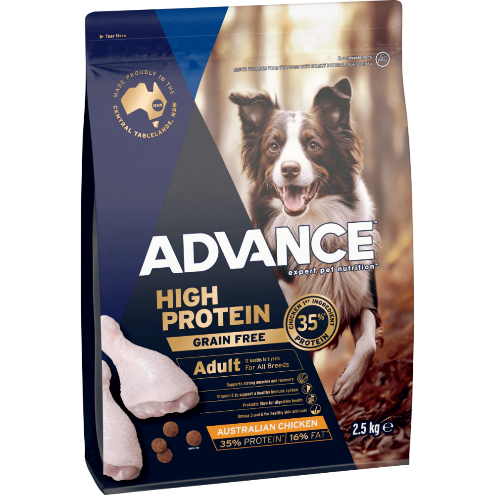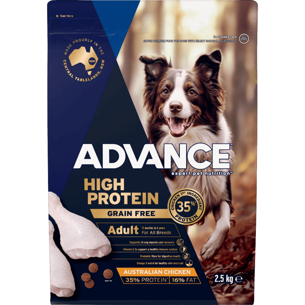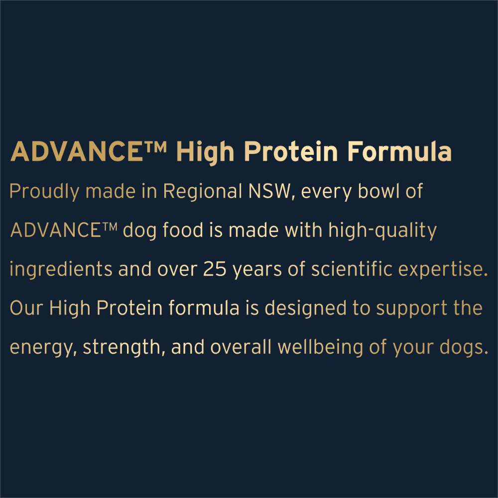Advance High Protein Adult Chicken Dry Dog Food is a scientifically formulated, Australian-made dry food designed to support the energy and strength of active adult dogs. This premium recipe uses high-quality chicken as the primary animal protein source to facilitate muscle recovery and maintenance while providing essential nutrients for overall pet wellbeing.