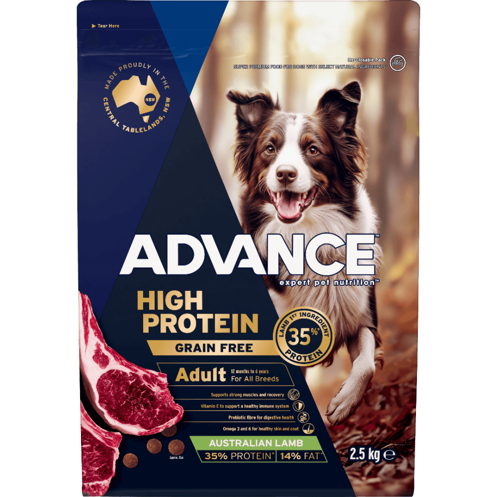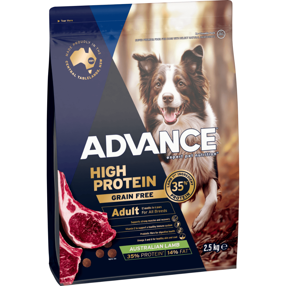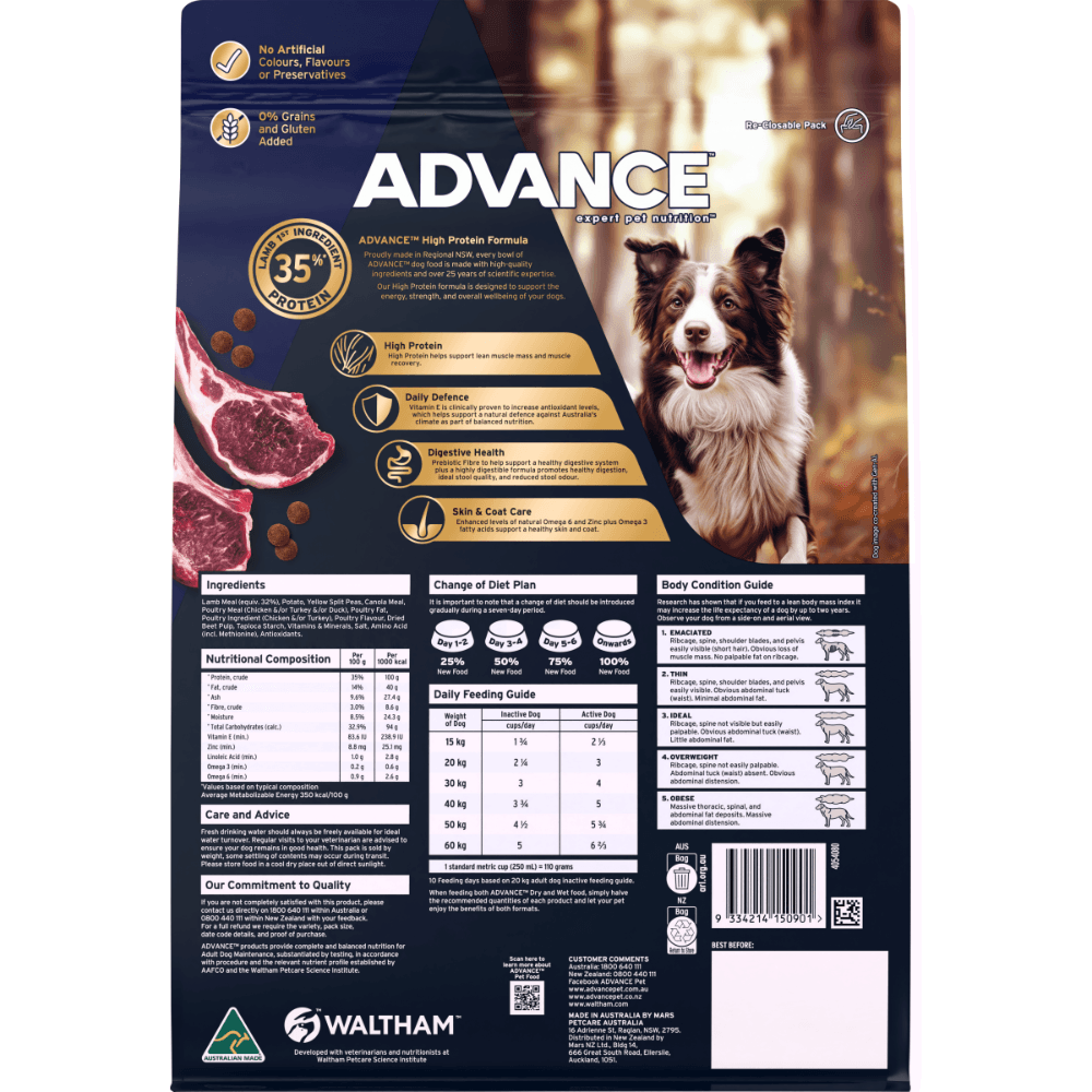 Advance High Protein Adult Lamb Dry Dog Food is a scientifically formulated dry kibble designed to support the energy and strength of active adult dogs through high-quality nutrition. This Australian-made recipe features lamb as the primary animal protein source to facilitate muscle recovery and overall body condition, ensuring your pet remains in peak physical health.