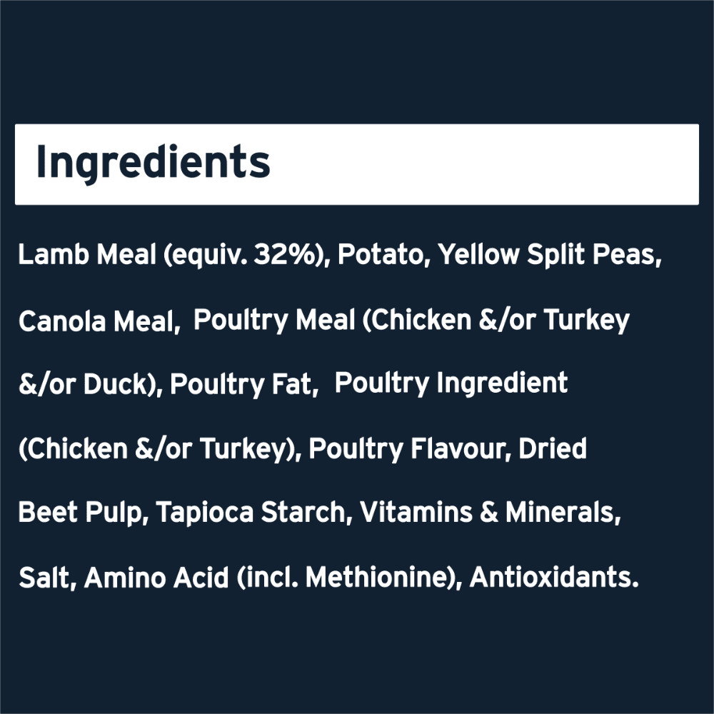 - High quality lamb meal provides the primary source of animal protein to support strong muscles and efficient tissue repair in active dogs