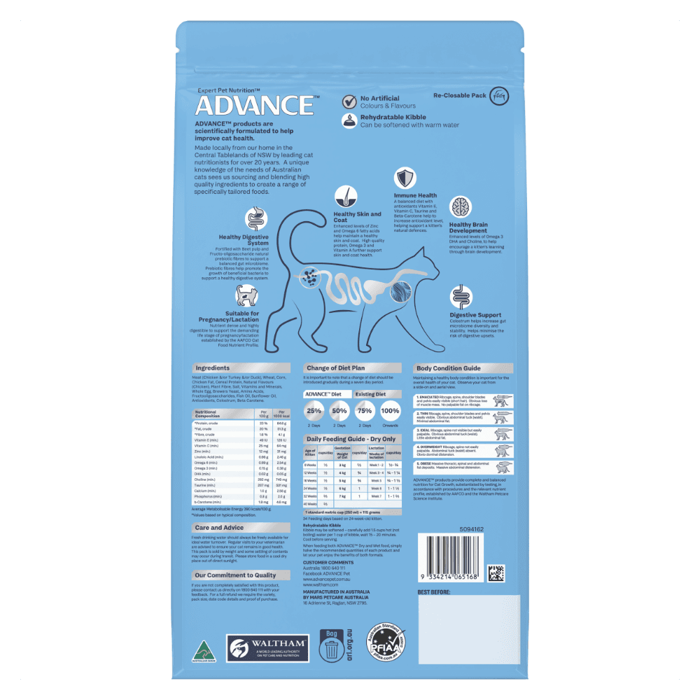 ADVANCE Kitten Dry Cat Food Chicken is specially crafted to provide your growing kitten with the essential nutrients they need for a healthy start in life. This nutrient-rich, formula is packed with high-quality proteins, minerals, and fibres, ensuring optimal growth and development while supporting strong bones and joints.