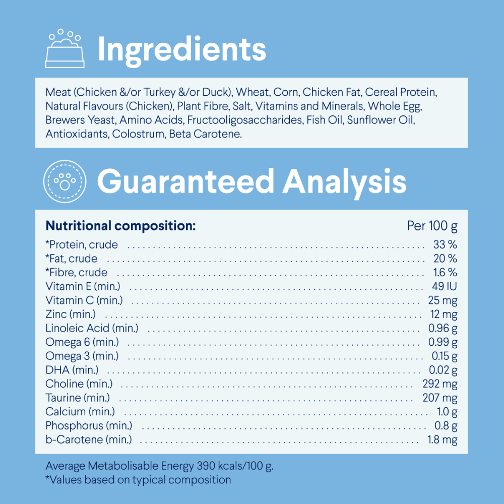 Meat (Chicken &/Or Turkey &/Or Duck), Wheat, Corn, Chicken Fat, Cereal Protein, Natural Flavours (Chicken), Plant Fibre, Salt, Vitamins And Minerals, Whole Egg, Brewers Yeast, Amino Acids, Fructooligosaccharides, Fish Oil, Sunflower Oil, Antioxidants, Colostrum, Beta Carotene