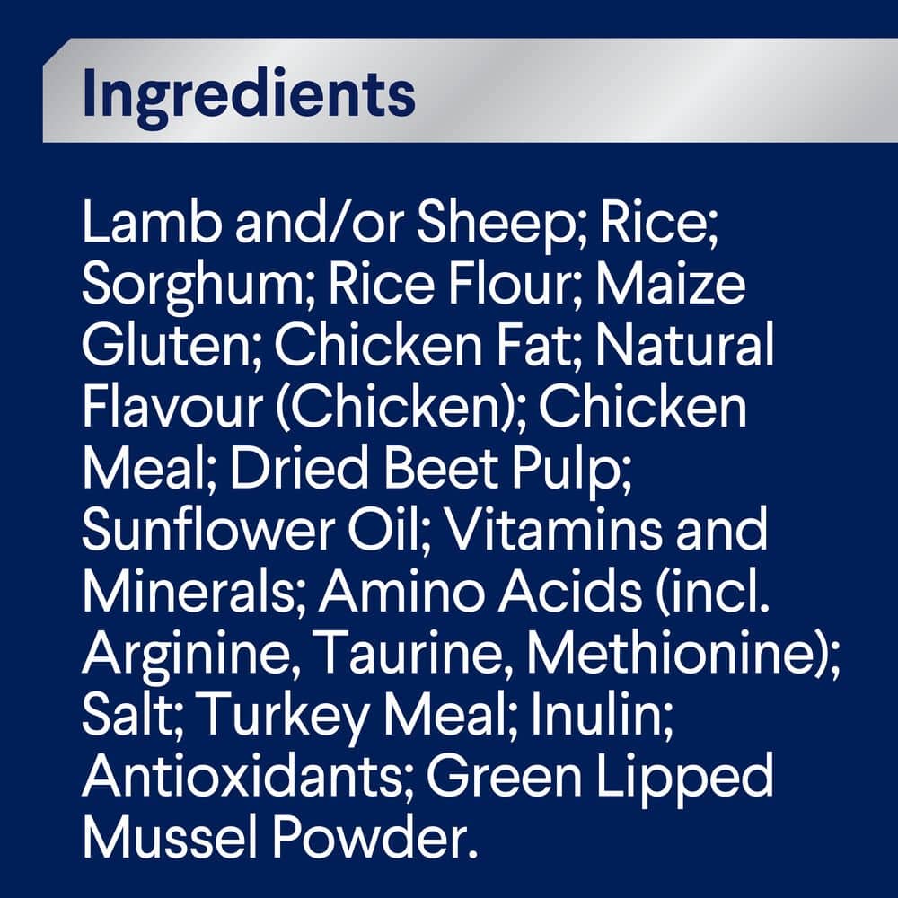 Lamb and/or Sheep Meal, Rice, Sorghum, Rice Flour, Maize Gluten, Chicken Fat, Chicken Meal, Natural Flavour (Chicken), Dried Beet Pulp, Sunflower Oil, Vitamins and Minerals, Amino Acids (incl. Arginine, Taurine and Methionine), Salt, Turkey Meal, Inulin, Antioxidants, Green Lipped Mussel Powder.