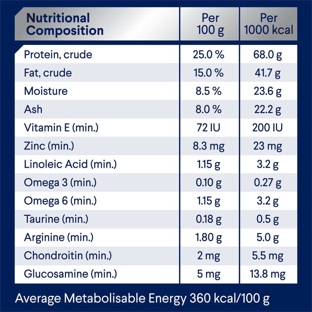 Lamb and/or Sheep Meal, Rice, Sorghum, Rice Flour, Maize Gluten, Chicken Fat, Chicken Meal, Natural Flavour (Chicken), Dried Beet Pulp, Sunflower Oil, Vitamins and Minerals, Amino Acids (incl. Arginine, Taurine and Methionine), Salt, Turkey Meal, Inulin, Antioxidants, Green Lipped Mussel Powder.