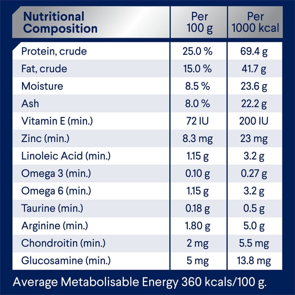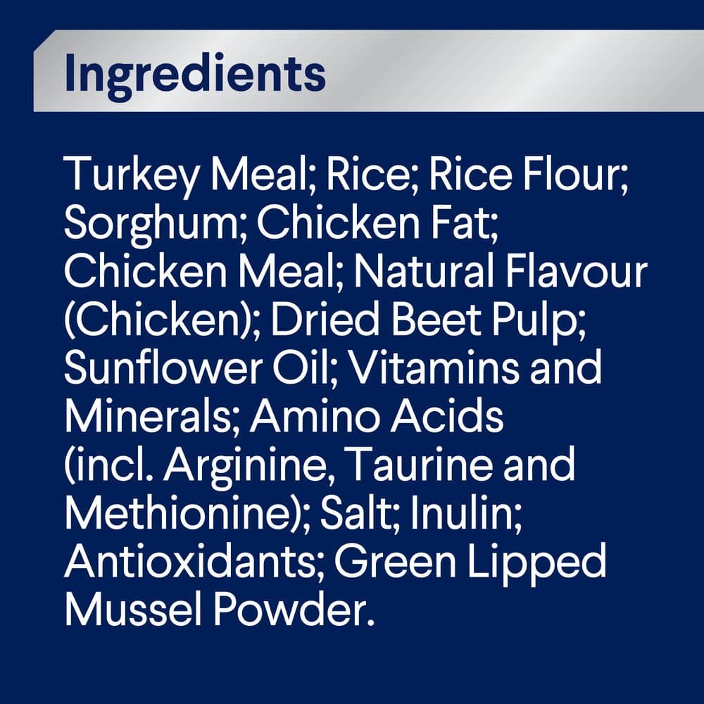 Turkey Meal, Rice, Rice Flour, Sorghum, Chicken Fat Chicken Meal, Natural Flavour (Chicken), Dried Beet Pulp, Sunflower Oil, Vitamins and Minerals, Amino Acids (incl. Arginine, Taurine and Methionine), Salt, Inulin, Antioxidants, Green Lipped Mussel Powder