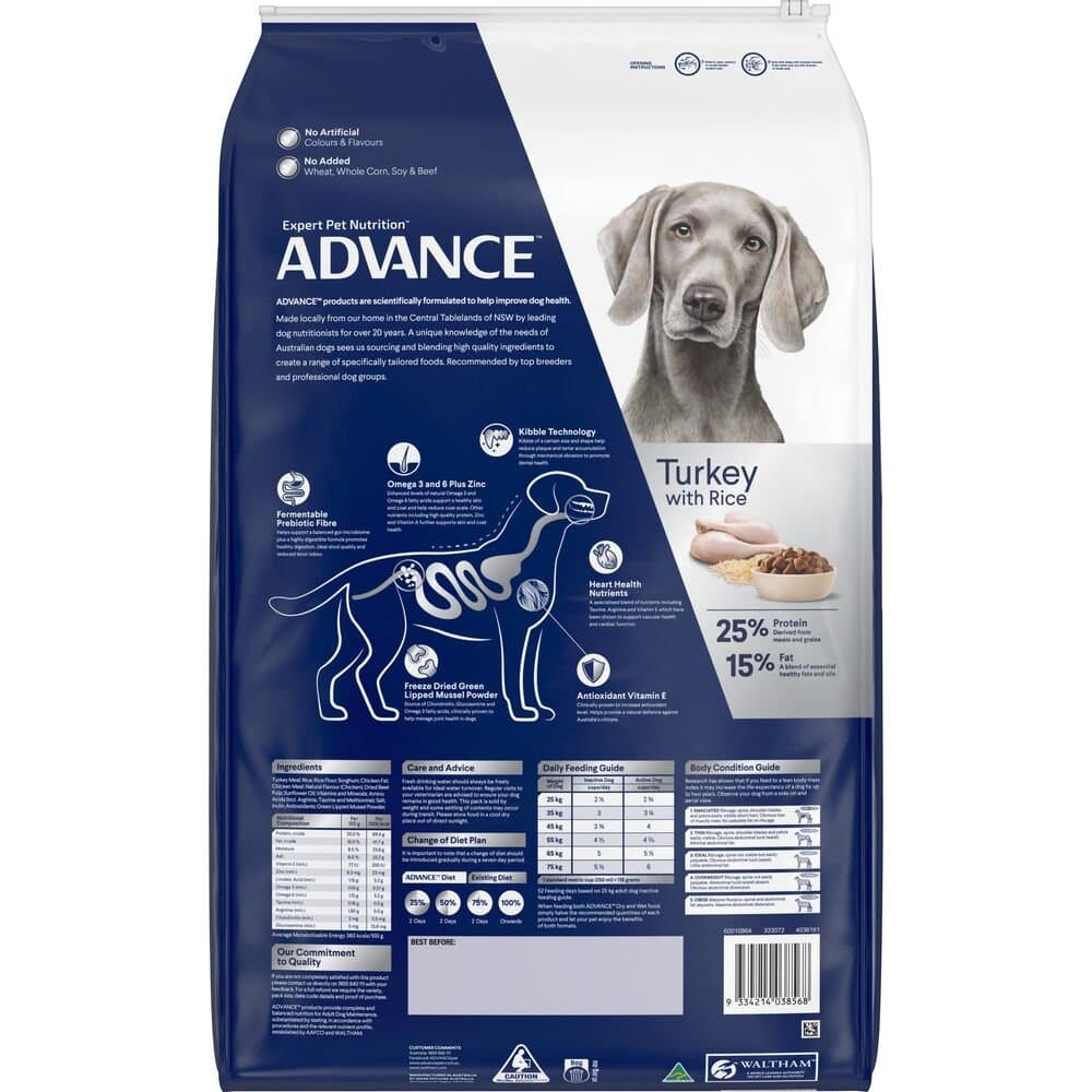 ADVANCE Large Adult Dry Dog Food Turkey with Rice is a premium, Australian-made formula designed to provide optimal nutrition for large adult dogs. Featuring high-quality turkey protein and a blend of health-supporting ingredients, this dry food supports joint health, heart health, digestion, and skin vitality.