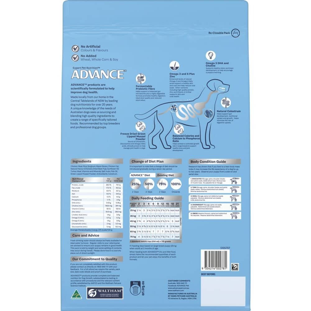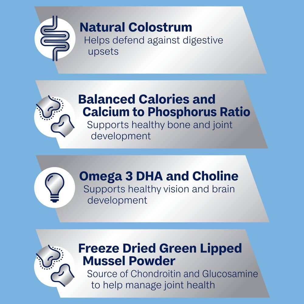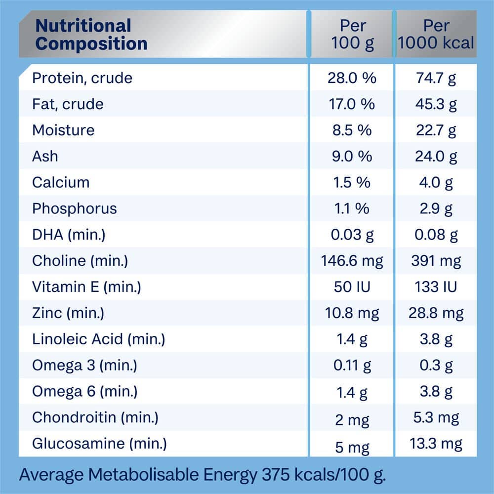 Chicken Meal, Rice, Sorghum, Maize Gluten, Chicken Fat, Dried Beet Pulp, Natural Flavour (Chicken), Sunflower Oil, Turkey Meal, Vitamins and Minerals, Salt, Inulin, Fish Oil, Green Lipped Mussel Powder, Antioxidants, Colostrum