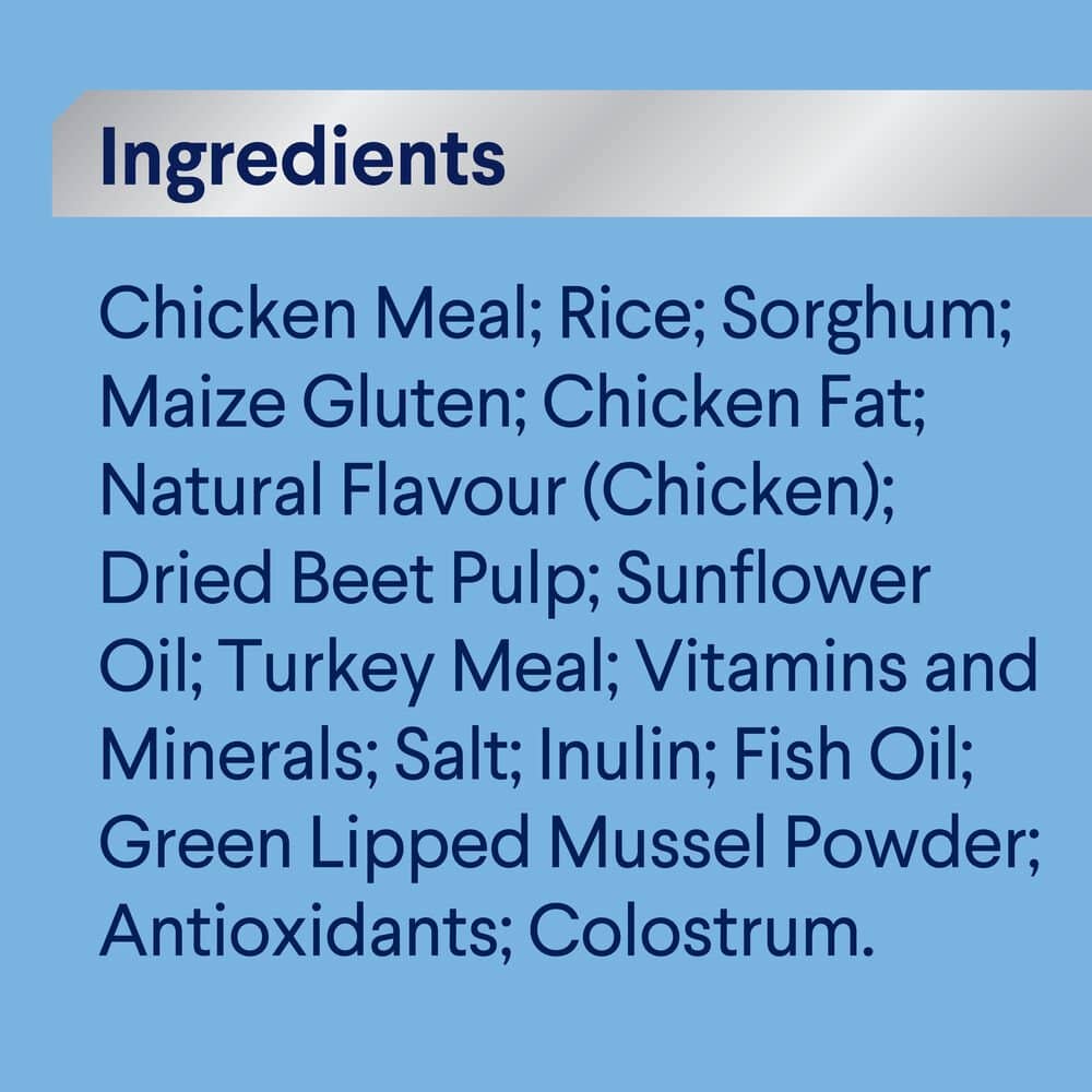 Chicken Meal, Rice, Sorghum, Maize Gluten, Chicken Fat, Dried Beet Pulp, Natural Flavour (Chicken), Sunflower Oil, Turkey Meal, Vitamins and Minerals, Salt, Inulin, Fish Oil, Green Lipped Mussel Powder, Antioxidants, Colostrum
