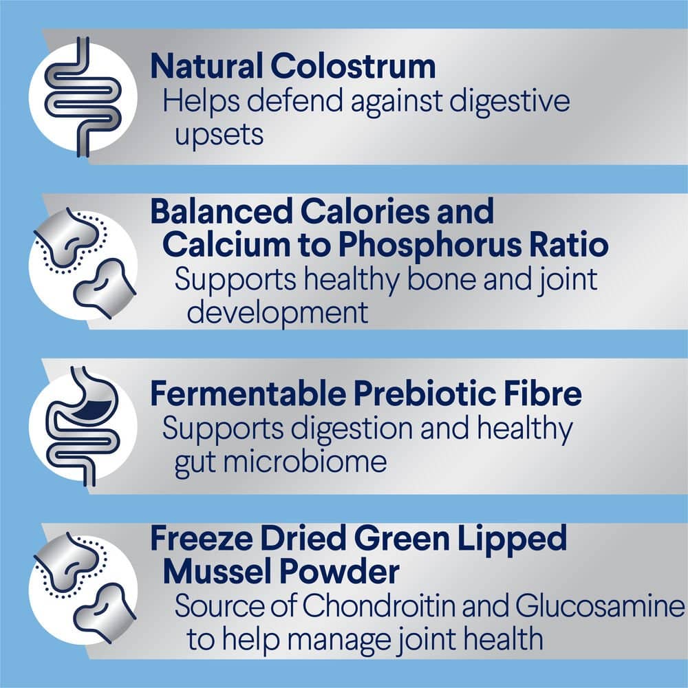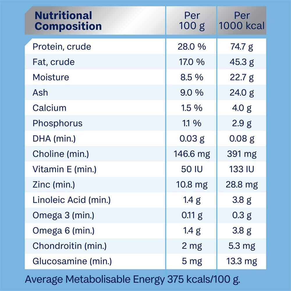 Chicken Meal, Rice, Sorghum, Maize Gluten, Chicken Fat, Dried Beet Pulp, Natural Flavour (Chicken), Sunflower Oil, Turkey Meal, Vitamins and Minerals, Salt, Inulin, Fish Oil, Green Lipped Mussel Powder, Antioxidants, Colostrum