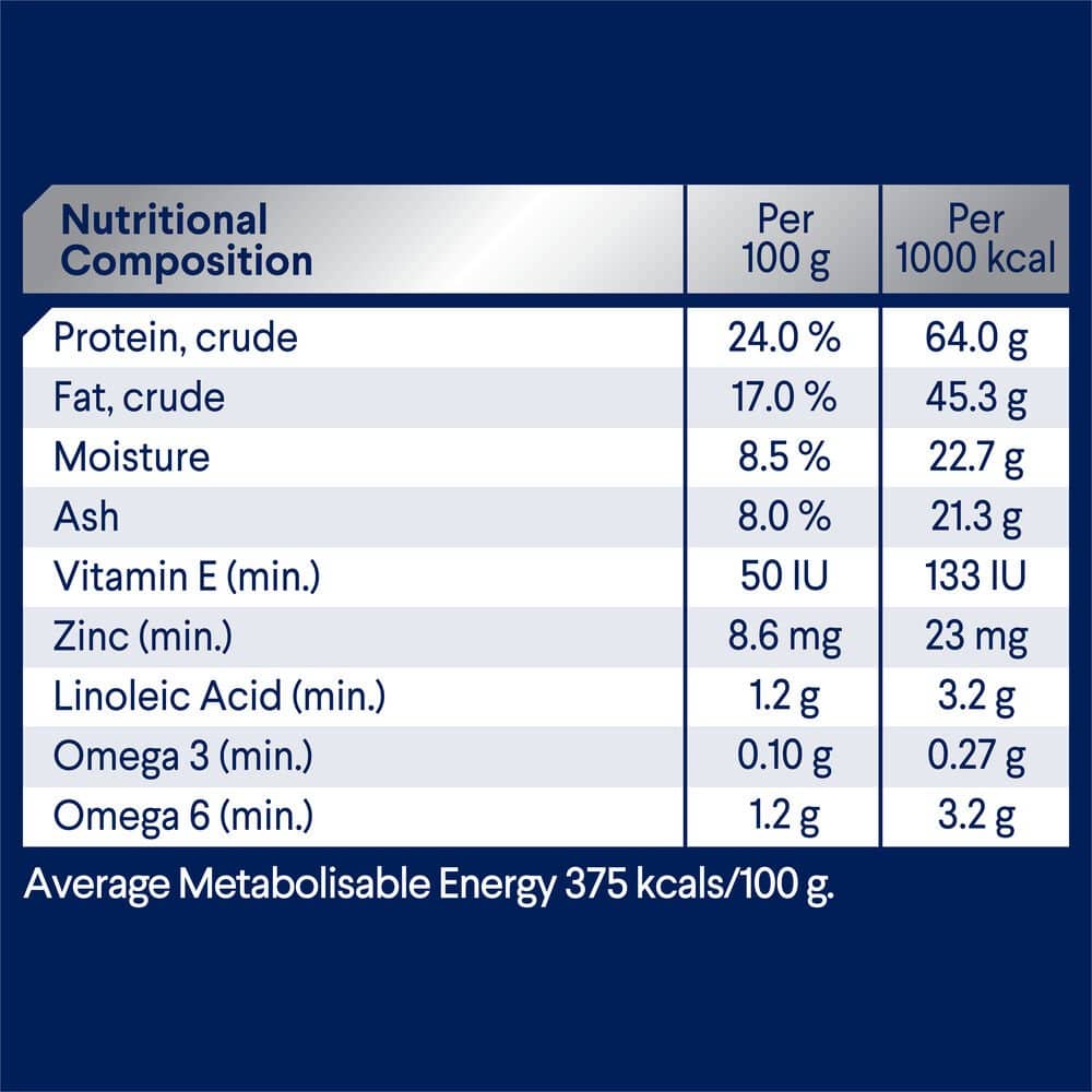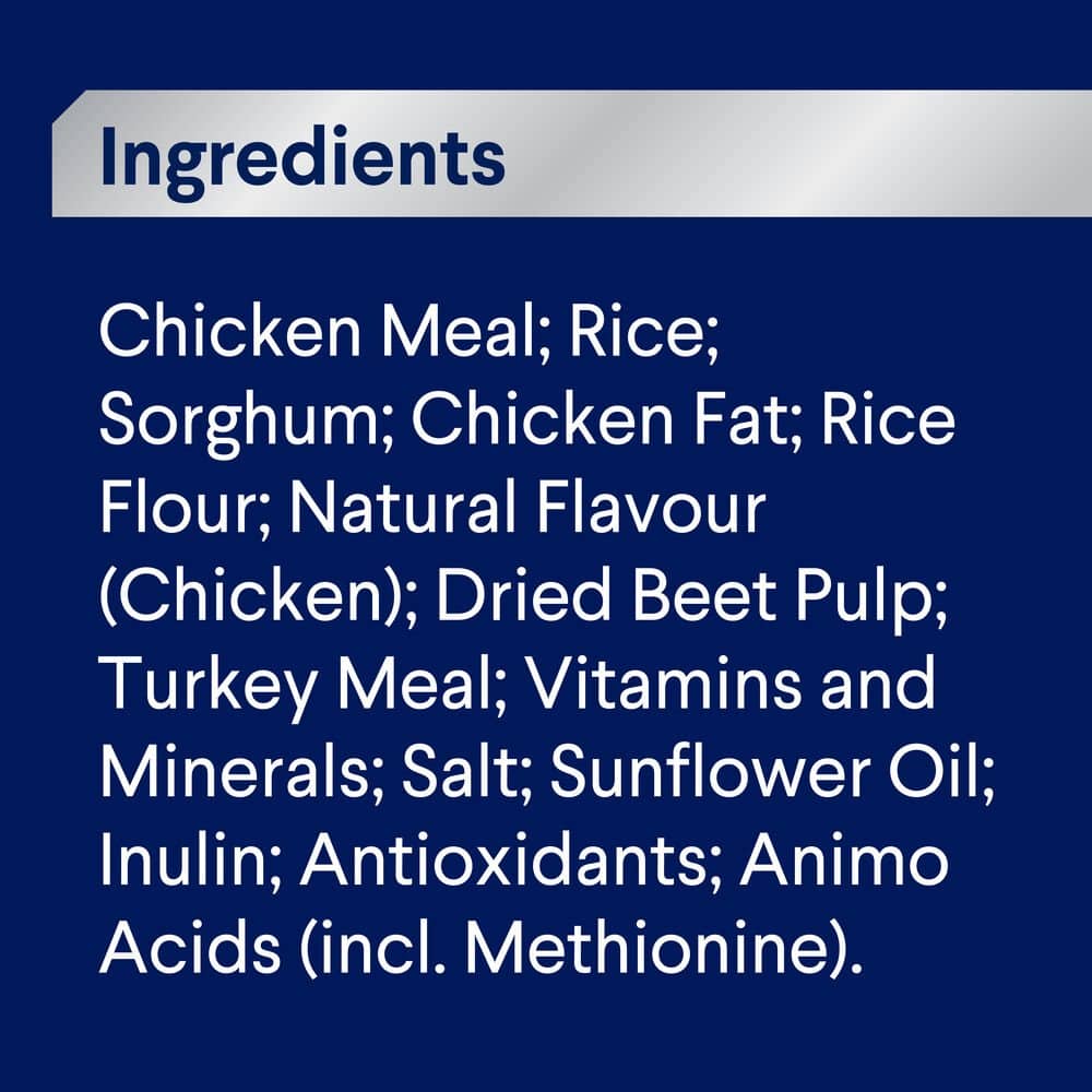 Chicken Meal, Rice, Sorghum, Chicken Fat, Rice Flour, Dried Beet Pulp, Natural Flavour (Chicken), Turkey Meal, Vitamins and Minerals, Salt, Sunflower Oil, Inulin, Antioxidants, Amino Acids (incl. Methionine)