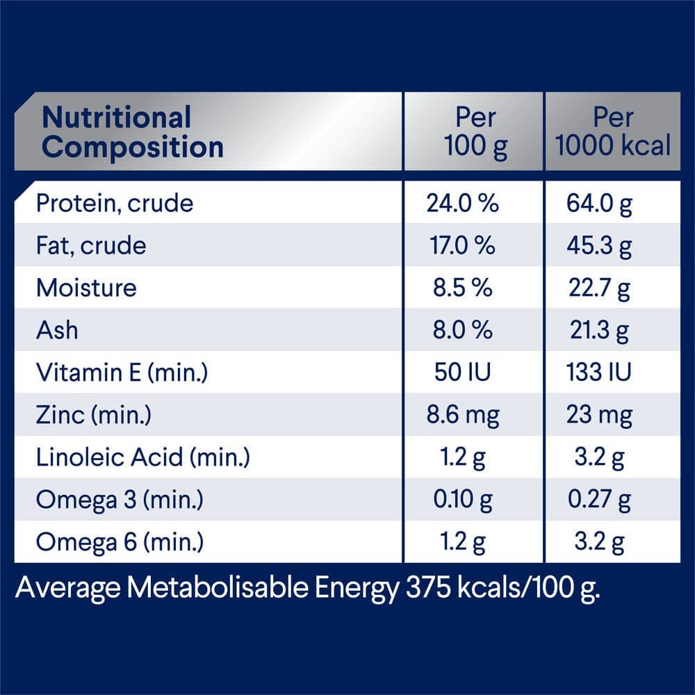 Chicken Meal, Rice, Sorghum, Chicken Fat, Rice Flour, Dried Beet Pulp, Natural Flavour (Chicken), Turkey Meal, Vitamins and Minerals, Salt, Sunflower Oil, Inulin, Antioxidants, Amino Acids (incl. Methionine)