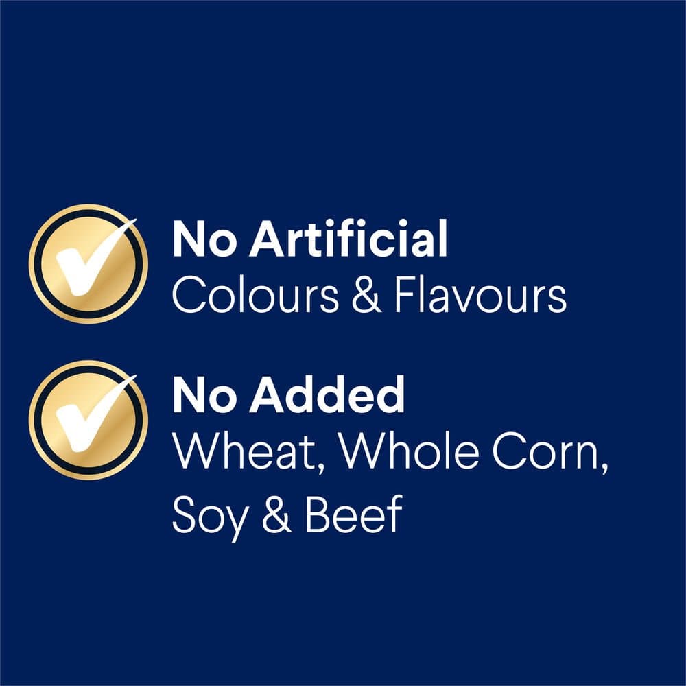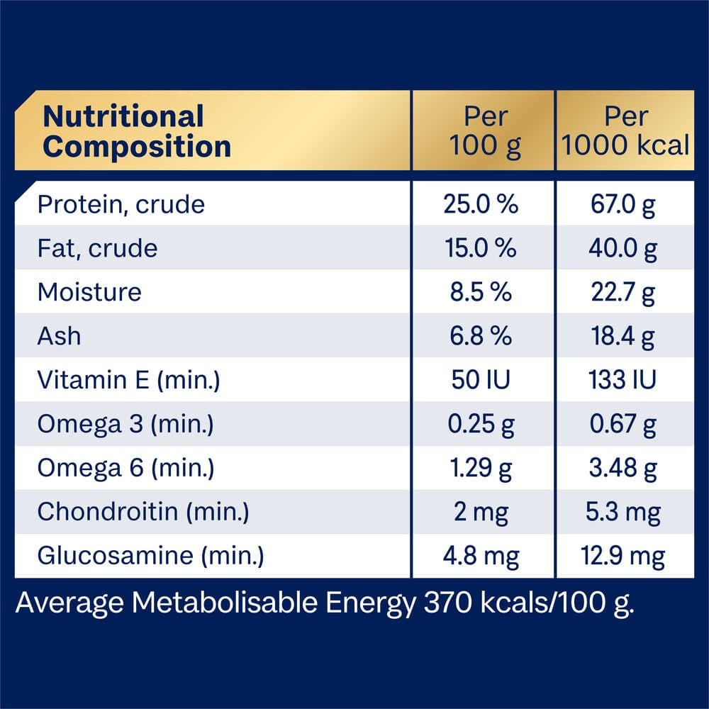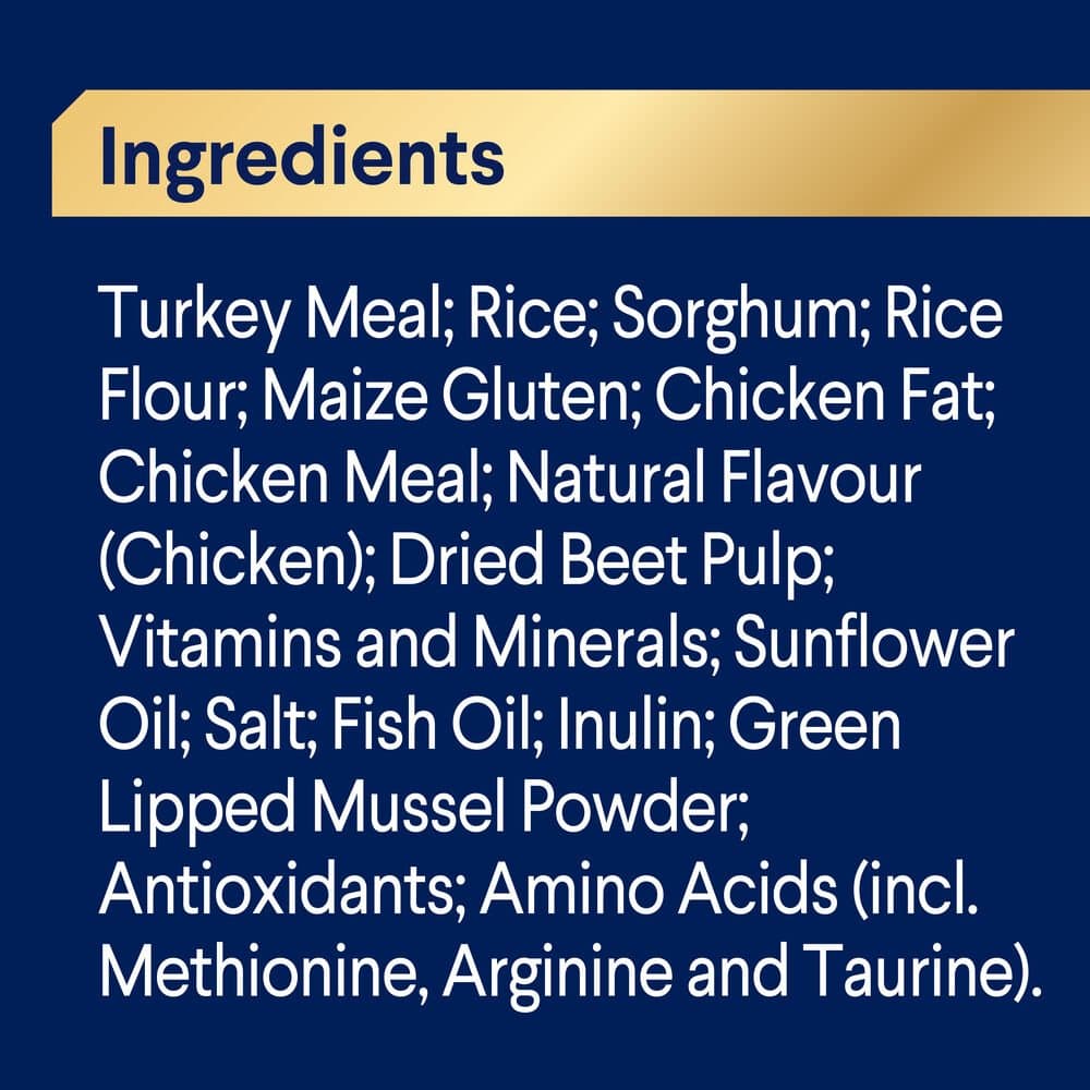 Turkey Meal, Rice, Sorghum, Rice Flour, Maize Gluten, Chicken Fat, Chicken Meal, Natural Flavour (Chicken), Dried Beet Pulp, Vitamins and Minerals, Sunflower Oil, Salt, Fish Oil, Inulin, Green Lipped Mussel Powder, Antioxidants, Amino Acids (incl. Methionine, Arginine and Taurine)