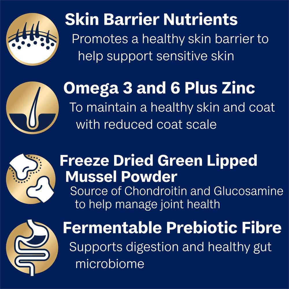 Turkey Meal, Rice, Sorghum, Rice Flour, Maize Gluten, Chicken Fat, Chicken Meal, Natural Flavour (Chicken), Dried Beet Pulp, Vitamins and Minerals, Sunflower Oil, Salt, Fish Oil, Inulin, Green Lipped Mussel Powder, Antioxidants, Amino Acids (incl. Methionine, Arginine and Taurine)