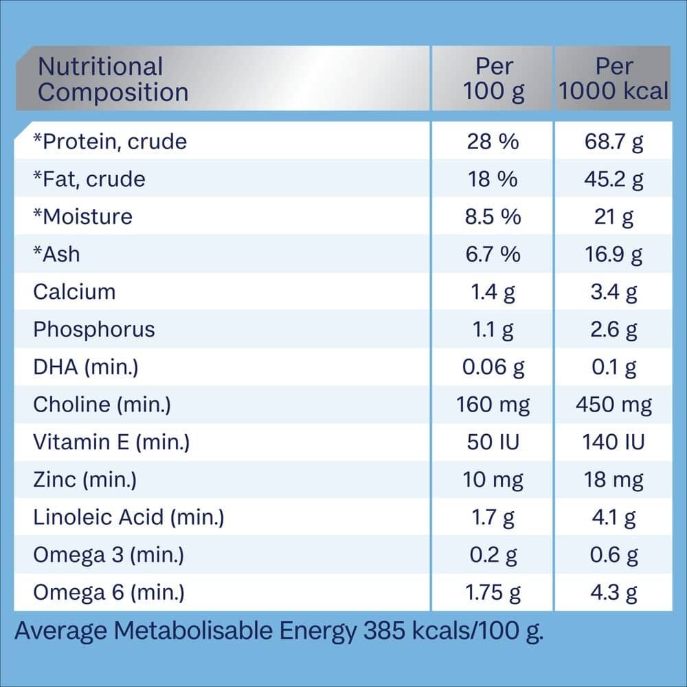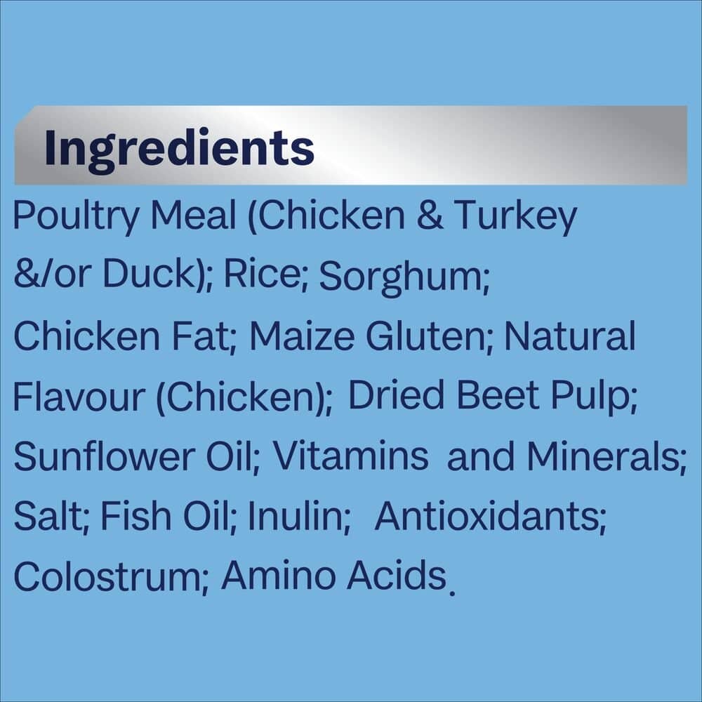 Poultry Meal (Chicken & Turkey &/Or Duck), Rice, Sorghum, Chicken Fat, Maize Gluten, Natural Flavour (Chicken), Dried Beet Pulp, Sunflower Oil, Vitamins And Minerals, Salt, Fish Oil, Inulin, Antioxidants, Colostrum, Amino Acids