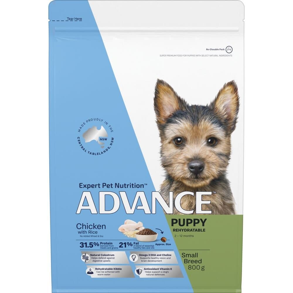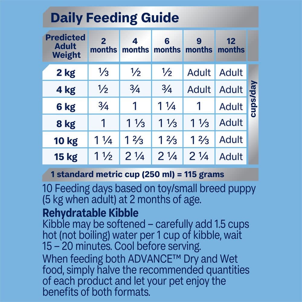 ADVANCE Puppy Small Rehydratable Dry Dog Food Chicken with Rice is a carefully formulated, super premium dry kibble designed to meet the unique nutritional requirements of small breed puppies. This high-quality recipe ensures your puppy gets the essential nutrients they need to grow strong and healthy. The kibble can be softened with warm water, making it ideal for puppies during weaning or when a softer meal is preferred.