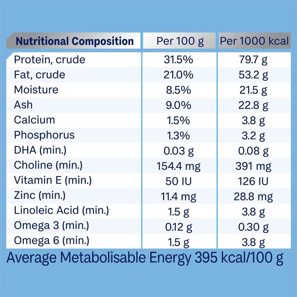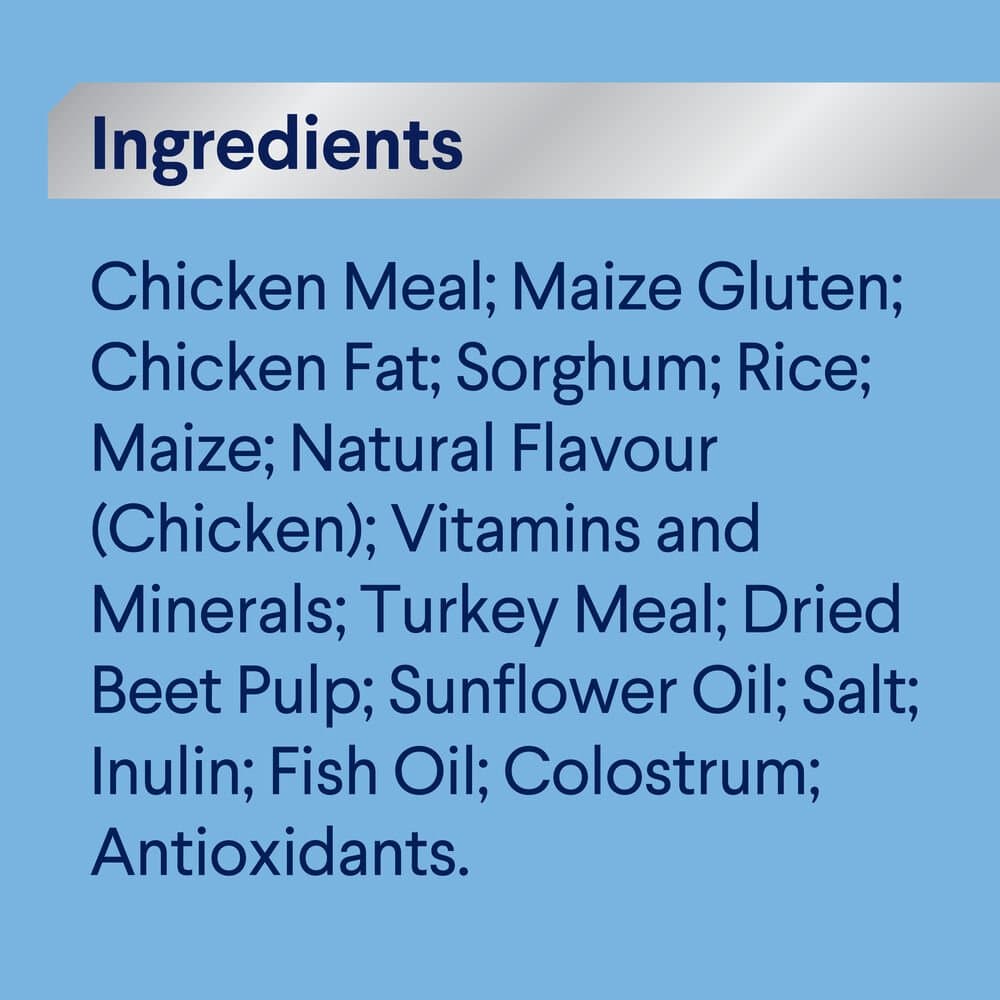 Chicken Meal, Rice, Maize Gluten, Chicken Fat, Sorghum, Dried Beet Pulp, Natural Flavour (Chicken), Sunflower Oil, Turkey Meal, Minerals, Salt, Inulin, Vitamins, Fish Oil, Colostrum, Antioxidants