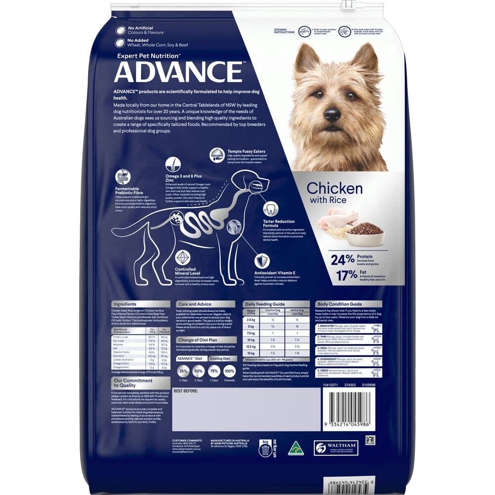 ADVANCE Small Adult Dry Dog Food Chicken with Rice is expertly crafted to meet the unique nutritional needs of small breed dogs, focusing on heart health and immune support. With ingredients like prebiotic fibre, Omega 3 and 6, and Vitamin E, this premium food promotes overall health, tartar reduction, and immune function, making it a trusted choice recommended by Australian veterinarians