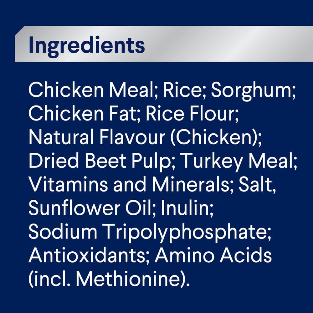 Chicken Meal, Rice, Sorghum, Chicken Fat, Rice Flour, Dried Beet Pulp, Natural Flavour (Chicken), Turkey Meal, Vitamins and Minerals, Salt, Sunflower Oil, Inulin, Sodium Tripolyphosphate, Antioxidants, Amino Acids (incl. Methionine)