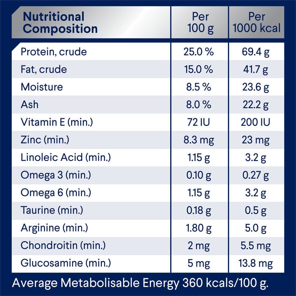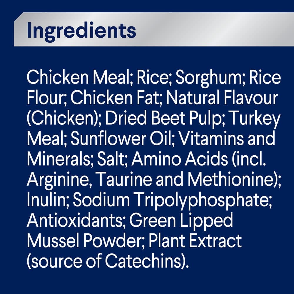 Chicken Meal, Rice, Sorghum, Rice Flour, Chicken Fat, Natural Flavour (Chicken), Dried Beet Pulp, Turkey Meal, Sunflower Oil, Vitamins and Minerals, Salt, Amino Acids (incl. Arginine, Taurine and Methionine), Inulin, Sodium Tripolyphosphate, Antioxidants, Green Lipped Mussel Powder, Plant Extract (source of Catechins)