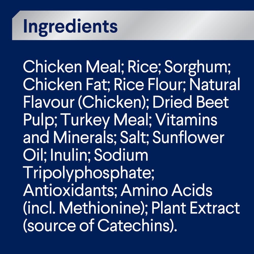 Chicken Meal, Rice, Sorghum, Chicken Fat, Rice Flour, Natural Flavour (Chicken), Dried Beet Pulp, Turkey Meal, Vitamins and Minerals, Salt, Sunflower Oil, Inulin, Sodium Tripolyphosphate, Antioxidants, Amino Acids (incl. Methionine), Plant Extract (source of Catechins)
