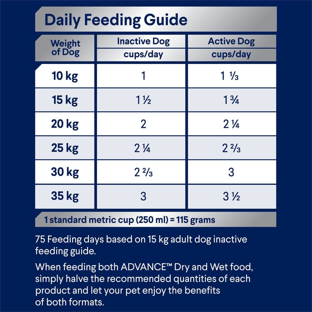 ADVANCE Triple Action Dental Care Medium Adult Dry Dog Food Chicken with Rice is a premium formula designed to support the dental health and overall well-being of medium breed adult dogs. Combining high-quality chicken with rice, this carefully crafted food delivers essential nutrition while targeting specific health concerns such as dental hygiene, digestion, and skin health.