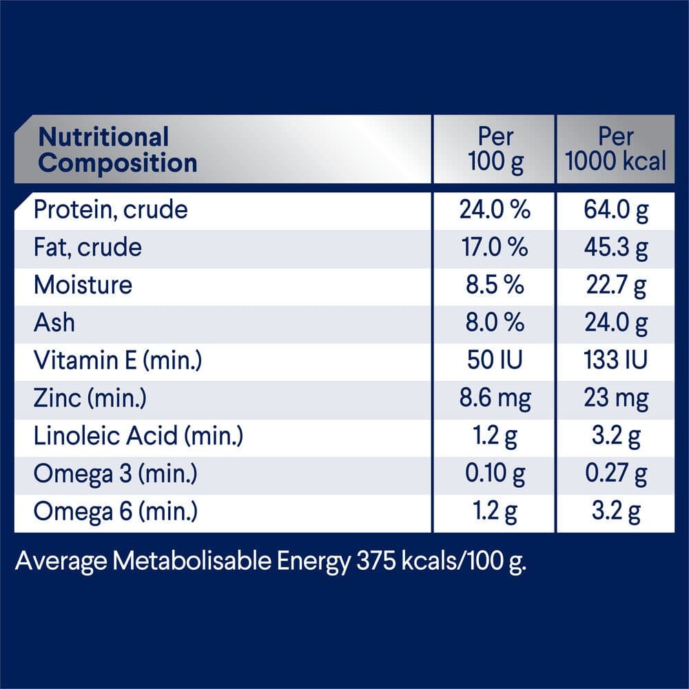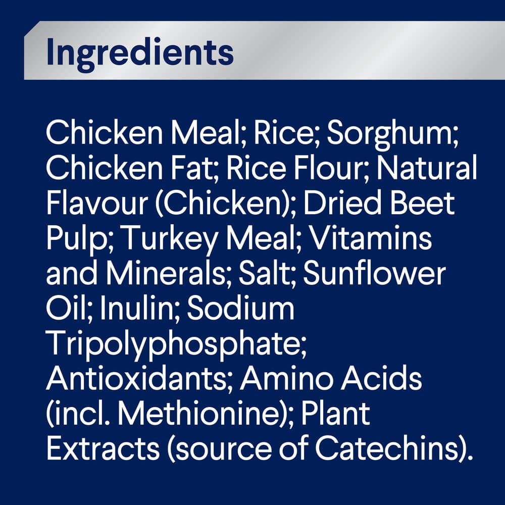 Chicken Meal, Rice, Sorghum, Chicken Fat, Rice Flour, Dried Beet Pulp, Natural Flavour (Chicken), Turkey Meal, Vitamins and Minerals, Salt, Sunflower Oil, Inulin, Sodium Tripolyphcsphate, Antioxidants, Amino Acids (incl. Methionine), Plant Extracts (source of Catechins)